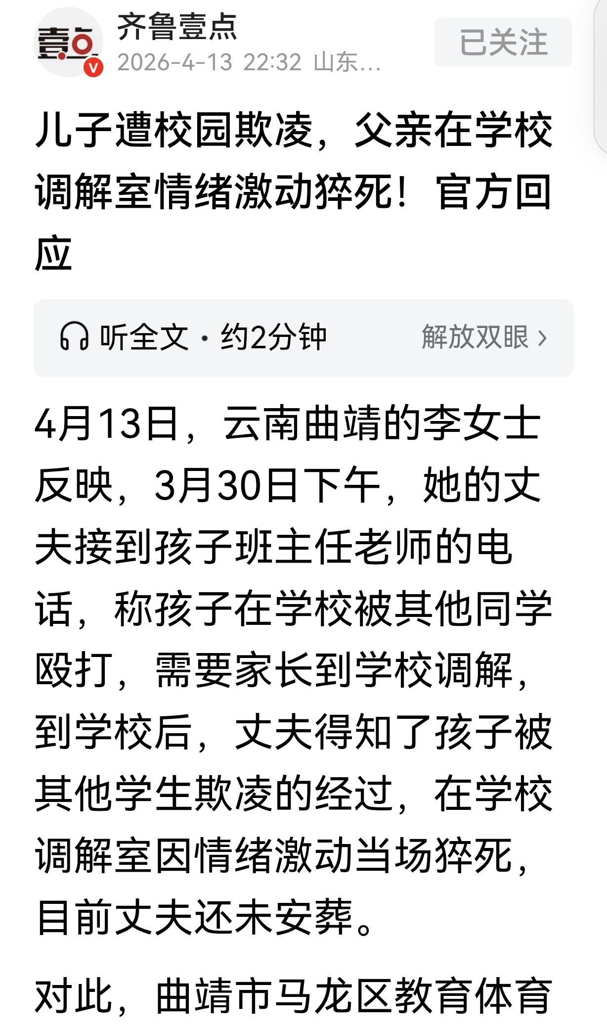 云南曲靖,一49岁男子,接到儿子班主任电话,说他儿子遭校园欺凌,被同学打了,让他去学校调解,男子听了心疼坏了,进调解室没几分钟,一激动气死了,妻子悲痛欲绝,要求学校必须给个说法。