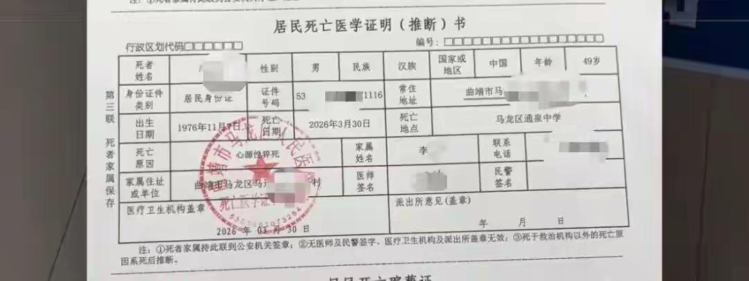 谁能想到就这么一下子没了。医院开的死亡医学证明上写着,杨先生的死因是心源性猝死,死亡地点就是中学。