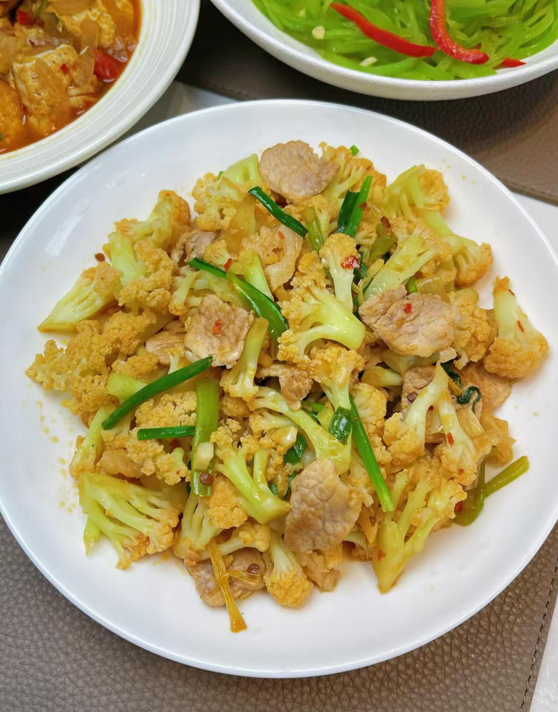 倒入焯水后的花菜翻炒,加盐、生抽,出锅前放小葱段脆嫩入味,营养在线,给长辈做超合适,春季吃着养人~