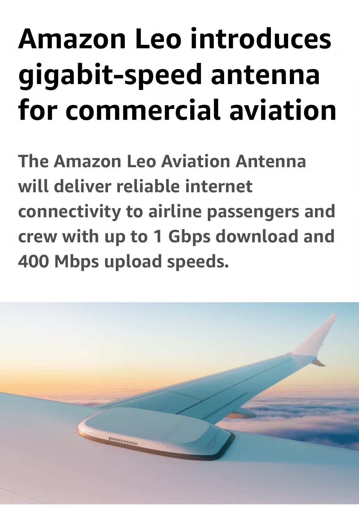相比较于Starlink,Amazon Leo的航空天线能够提供的连接速度是Starlink标称的4倍多。