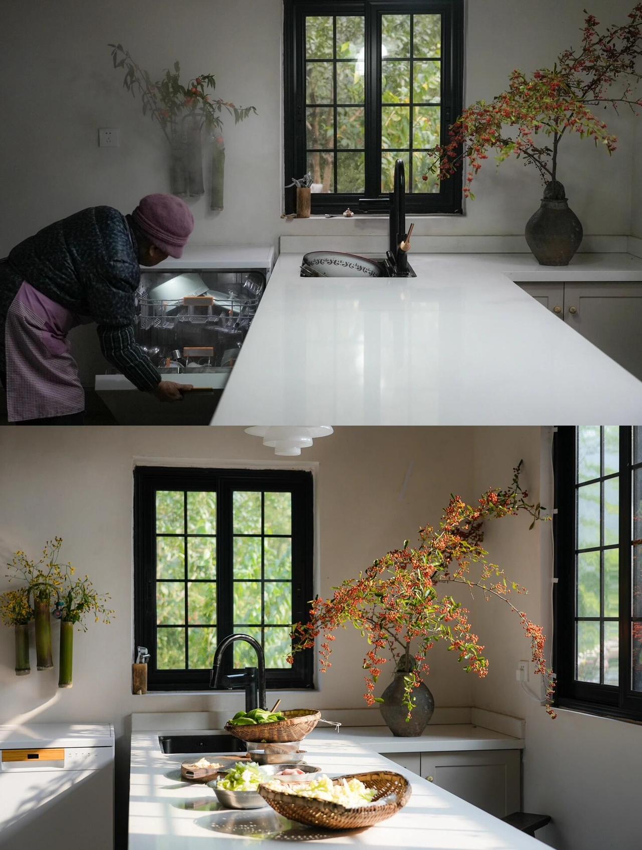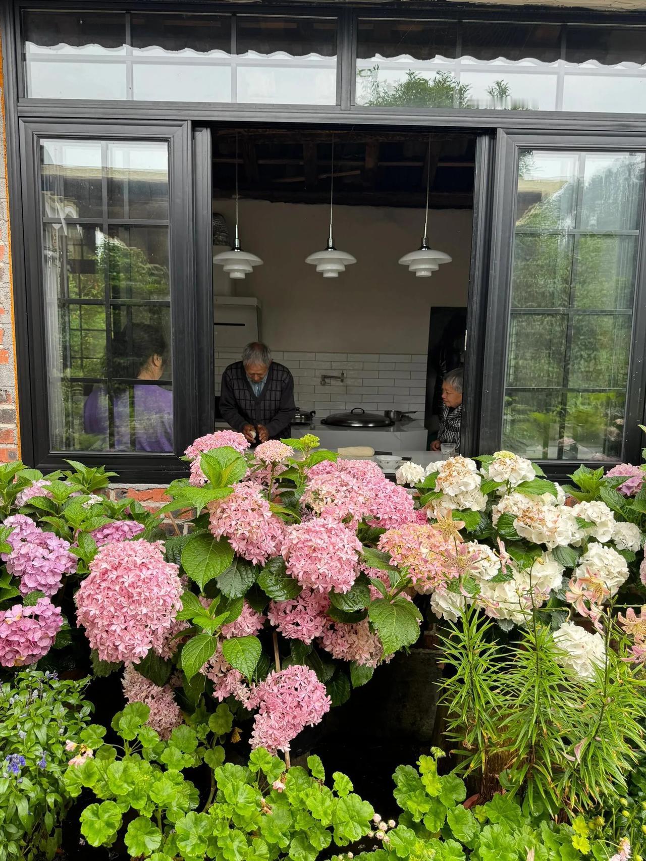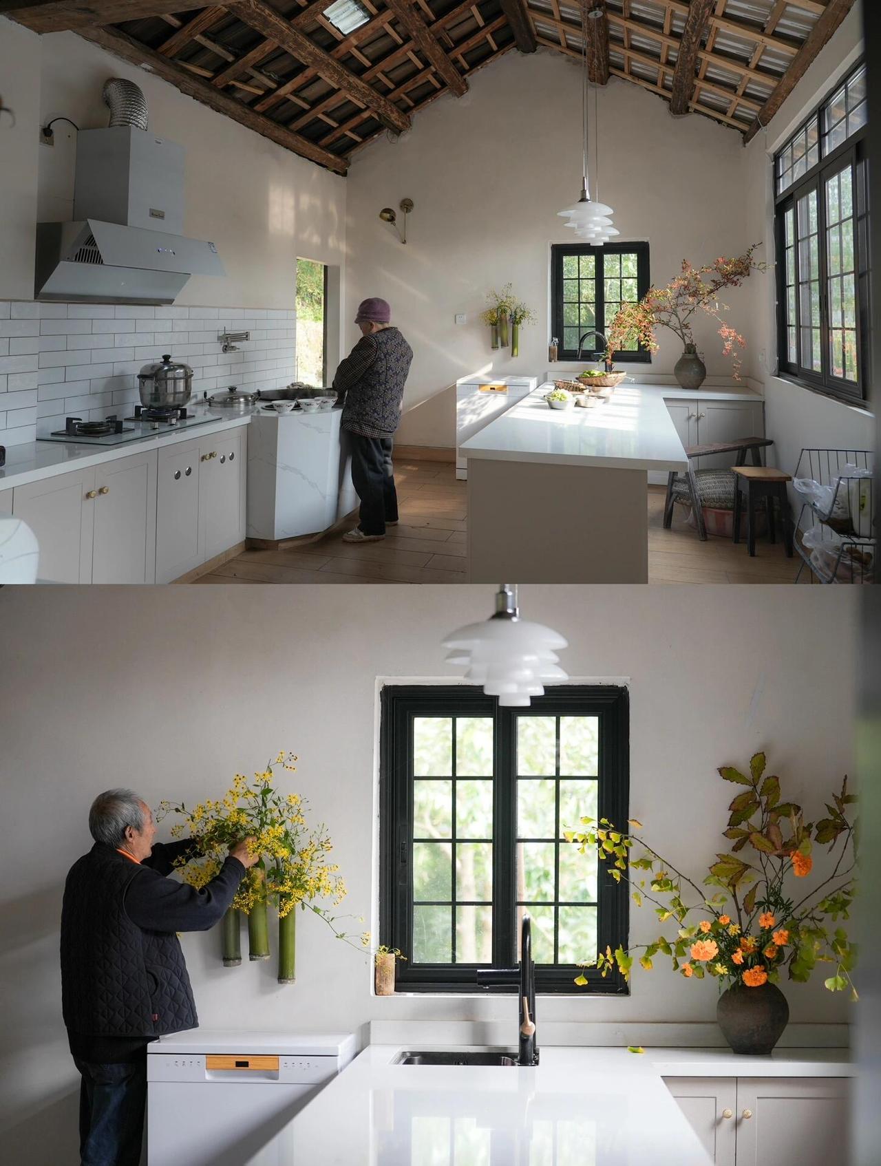 他们先在小菜园旁边开出一片花园,到处捡旧罐子、破陶盆回来种多肉,嫌门口水泥地太秃,干脆砸掉,砌成花池,又拆掉土灶房的一面墙,原本又黑又小的厨房一下子亮堂了。
