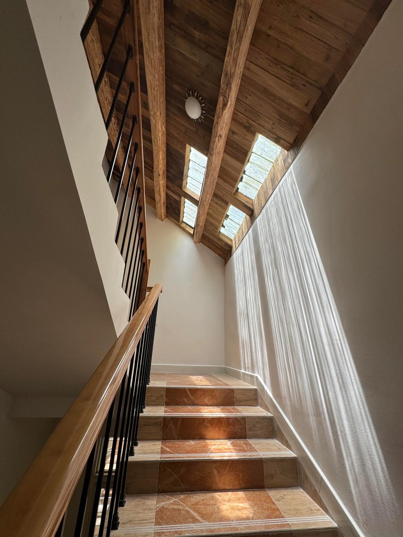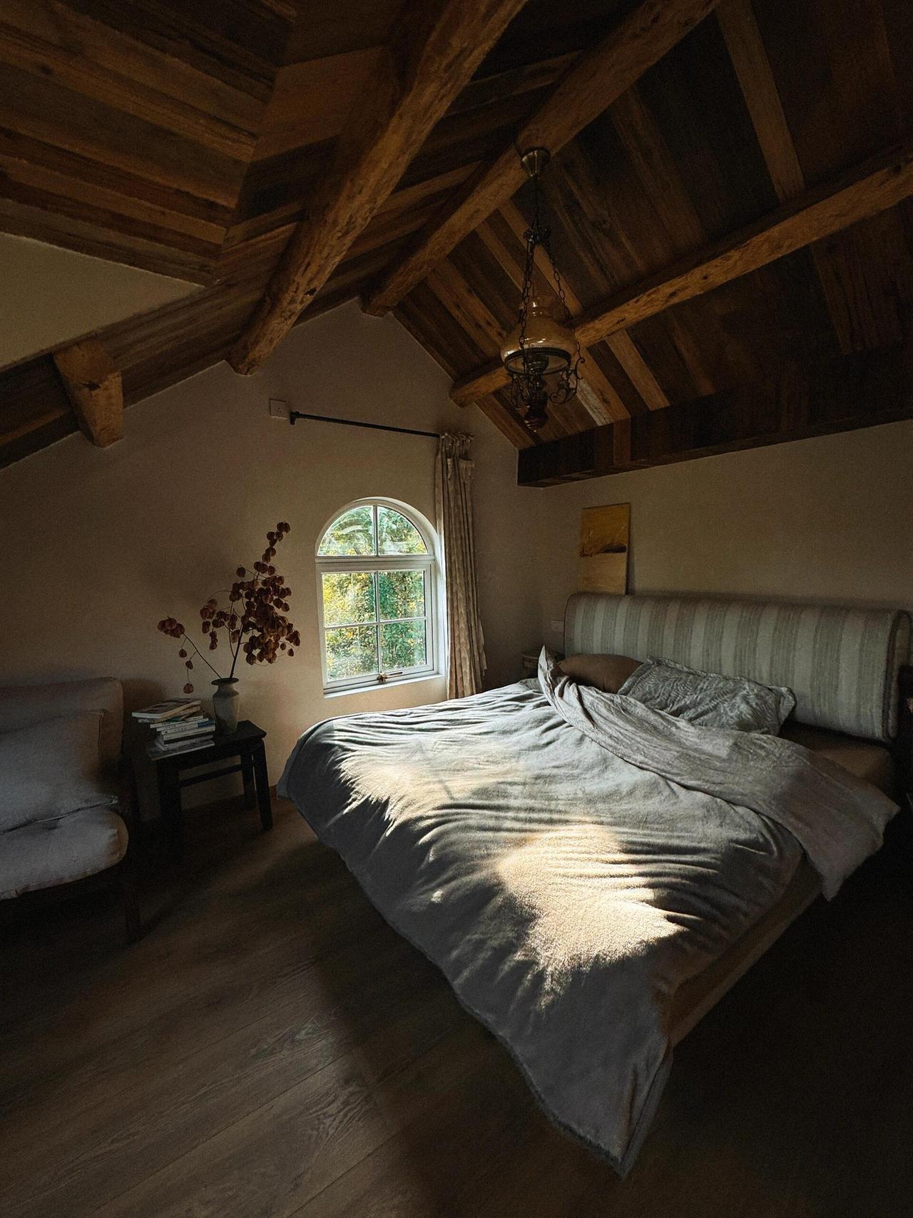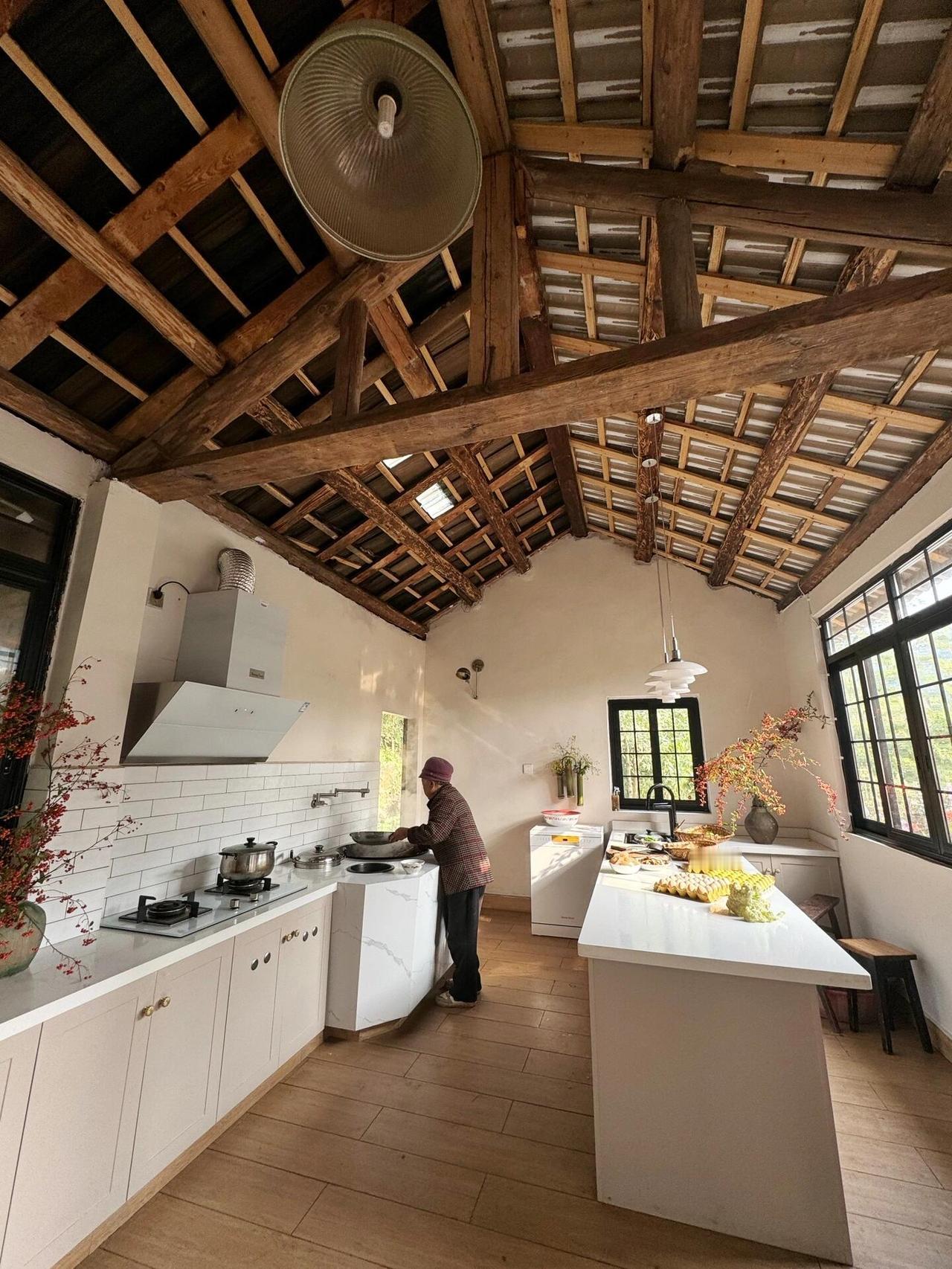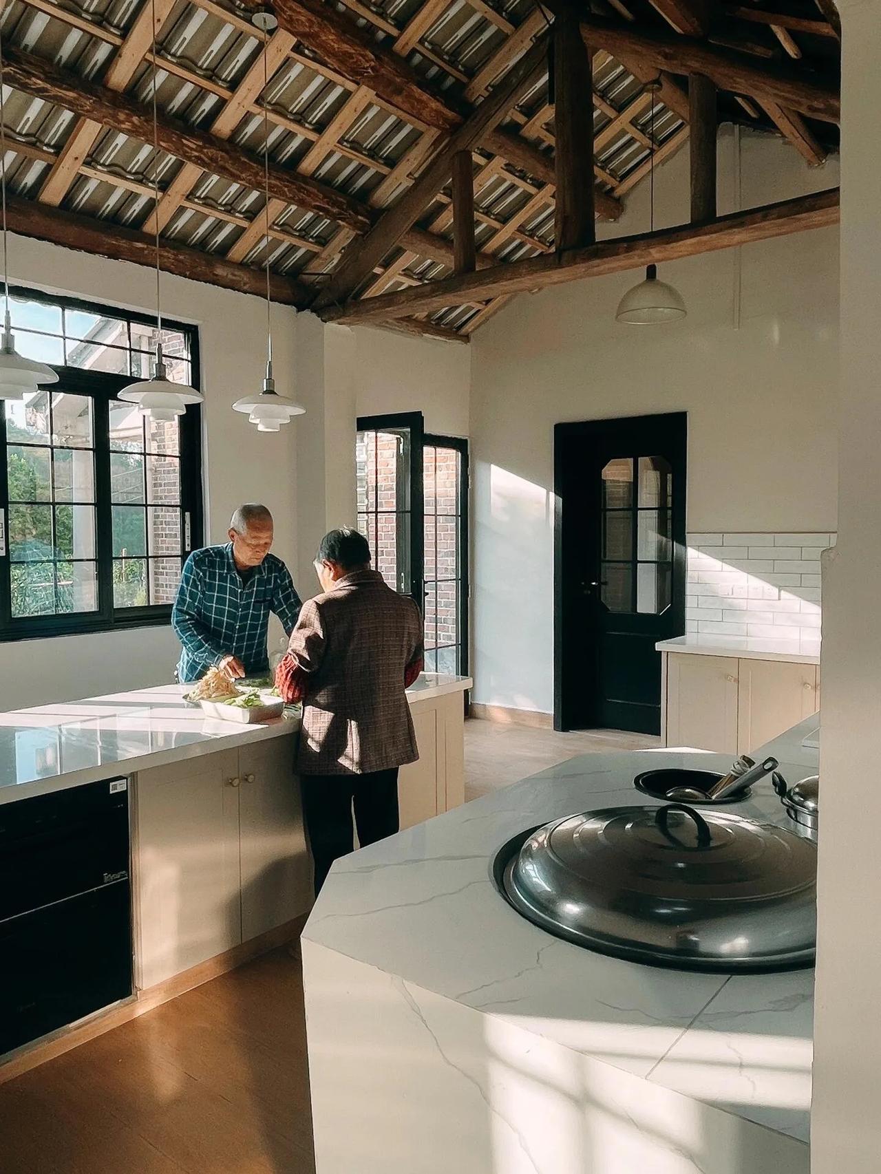 一楼重新布置了客厅、餐厅、烤火房,光线和动线都顺了,老人房清掉堆积的杂物,套进卫生间和衣柜,收纳整整齐齐,三楼原本闷得不透气的塑扣板吊顶被拆掉,露出温润的老房梁,阁楼瞬间有了呼吸感。