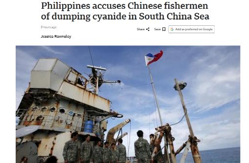 菲律宾在没有拿出任何证据的情况下,公开抹黑指责中国渔民在南沙群岛附近海域倾倒氰化物,还将这起疑似“投毒事件”描述为一起“破坏”行为,目的是“杀死当地鱼类种群”,并剥夺驻扎在所谓的“第二托马斯浅滩”(即中国仁爱礁)的菲律宾军队的重要食物来源。
