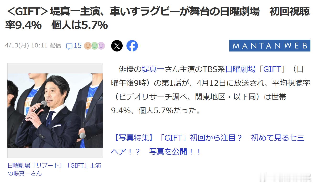 海外影视速递堤真一主演TBS4月期日9剧《GIFT》首集世代收视率9.4号个人收视率5.7。拥有天才头脑与学识的宇宙物理学家·伍铁文人(堤真一饰),专注于黑洞研究,却长期孤立,只以寻找难题并解开答案为人生意义。某日,他偶然去观摩轮椅橄榄球队的训练。这是一支三年未尝胜绩、队员间争执不断、毫无胜算氛围的弱小队伍。然而伍铁在完全不懂规则的情况下,宣告要将队伍带成日本第一。他与队员们正面碰撞、切磋,在了解每个人背负的生命伤痕的同时,也直面自己内心的难题。山田裕贵饰演弱队的王牌选手·宫下凉,有村架纯饰演杂志记者·雾山人香,本田响矢饰演轮椅上的不良少年·朝谷圭二郎,细田佳央太饰演轮椅橄榄球选手·谷口聪一。