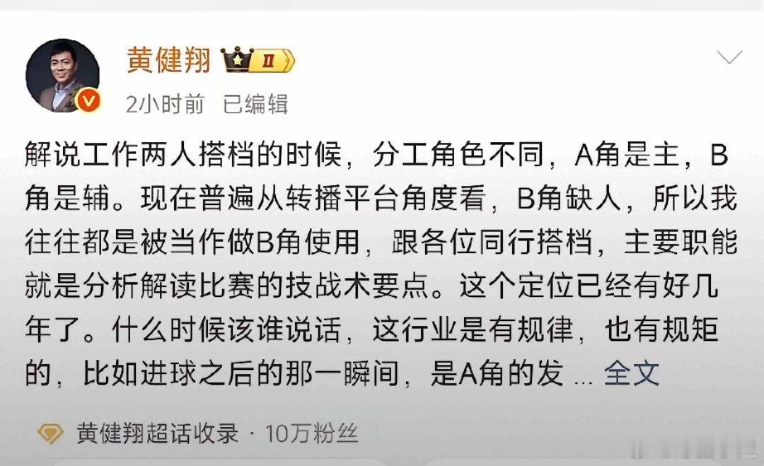 黄健翔回复争议:不能乱了规矩 黄健翔回应解说争议:恪守分工,主评技战术,不能乱了规矩4月13日,知名解说员黄健翔通过社交媒体发文,正式回应中超北京国安对阵成都蓉城一役中,部分球迷指责其解说偏向国安的争议。黄健翔表示,自己近年在转播中常被平台定位为B角(辅助解说),核心职责是解读技战术,与主解说(A角)分工明确。他强调:"什么时候该谁说话,行业有规律、有规矩",进球瞬间为主解说的发挥空间,B角需在赛后进行分析,不能乱了规矩。针对"立场不公"的批评,黄健翔否认个人偏见,称全程遵守职业规范 。