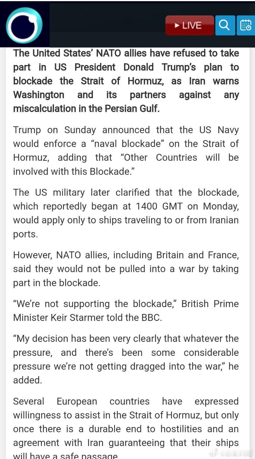 然而,包括英国和法国在内的北约盟国表示,他们不会因参与封锁而被卷入战争。英国首相基尔·斯塔默对英国广播公司表示:“我们不支持封锁。”他补充道:“我的决定非常明确,无论面临多大压力——确实存在相当大的压力——我们都不会被卷入这场战争。”几个欧洲国家表示愿意协助保障霍尔木兹海峡的安全,但前提是敌对行动彻底结束,并且与伊朗达成协议,确保其船只能够安全通行。