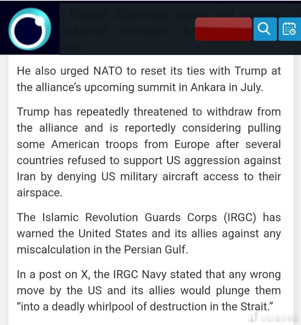 他还呼吁北约在 7 月于安卡拉举行的下一次峰会上重新与特朗普建立联系。特朗普多次威胁要退出该联盟,并且据报道,鉴于一些国家拒绝允许美国军机飞越其领空以支持美国对伊朗的军事行动,他正在考虑从欧洲撤出部分美军。伊斯兰革命卫队(IRGC)已向美国及其盟友发出警告,要求他们不要在波斯湾地区做出任何误判。在推特上的一则帖子中,伊斯兰革命卫队海军表示,美国及其盟友的任何不当举动都会将他们“拖入亚丁湾那场致命的毁灭漩涡之中”。(伊朗新闻电视台)