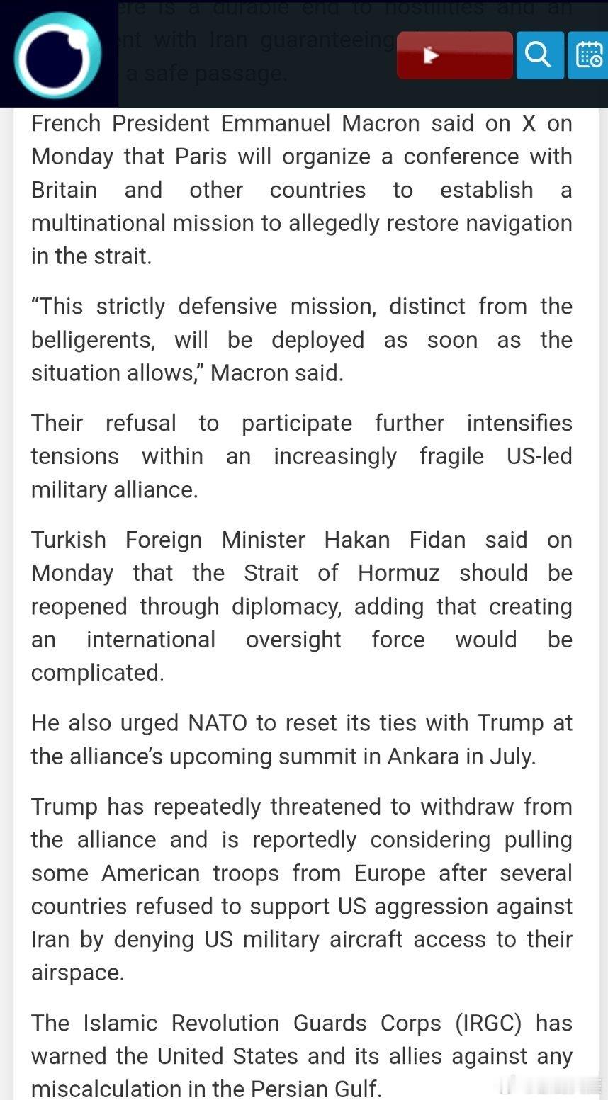 法国总统埃马纽埃尔·马克龙周一在 X 上表示,巴黎将与英国及其他国家共同组织一场会议,以建立一个多国任务小组,据称旨在恢复海峡的通航。马克龙表示:“一旦局势允许,这支与交战各方保持距离的纯粹防御性部队将立即部署。”他们拒绝进一步参与,这使得本已脆弱的以美国为首的军事联盟内部的紧张局势进一步加剧。土耳其外交部长哈坎·菲丹周一表示,应通过外交途径重新开放霍尔木兹海峡,并补充说组建一支国际监督部队会很复杂。