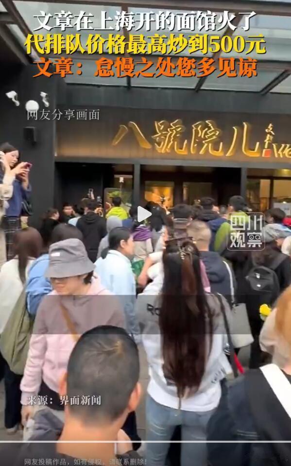 昨天我还说30块钱一碗的面条在上海不算贵呢,今天就让我大开眼界了,代排队都能炒到500元,这碗面是非吃不可吗?甚至有人凌晨就在门口排队了,只能说上海人民确实有钱有闲…..这个世界太癫狂了~咱就是说,这碗面就算再好吃,也不见得能比陕西的好吃吧?文章面馆代排队炒到500元32元一碗面到底贵吗文章面馆排长队顾客发声有顾客为打卡文章面馆凌晨12点来排队黄牛标价299代排文章面馆
