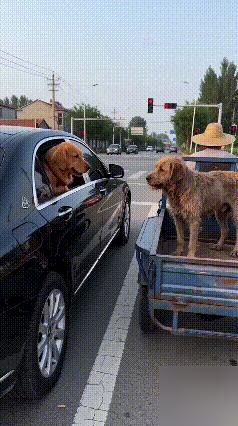 俩金毛红绿灯下互换座驾,这心眼子比人还多!