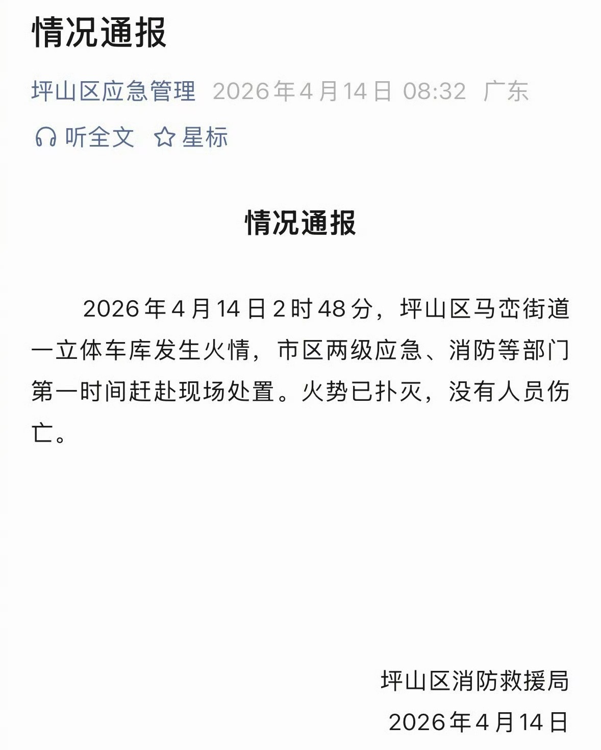 比亚迪回应深圳车库火灾扑灭了,没有人员伤亡。是存放报废和实验车辆的停车场。