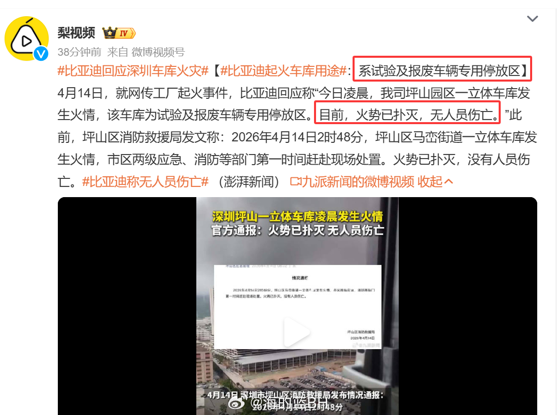 官方通报深圳比亚迪火灾 深圳比亚迪坪山厂区立体车库于今日(4月14日)凌晨突发火灾,官方通报明确火势已扑灭且无人员伤亡,初步调查指向外部施工单位操作不当所致,排除车辆或电池自燃可能。