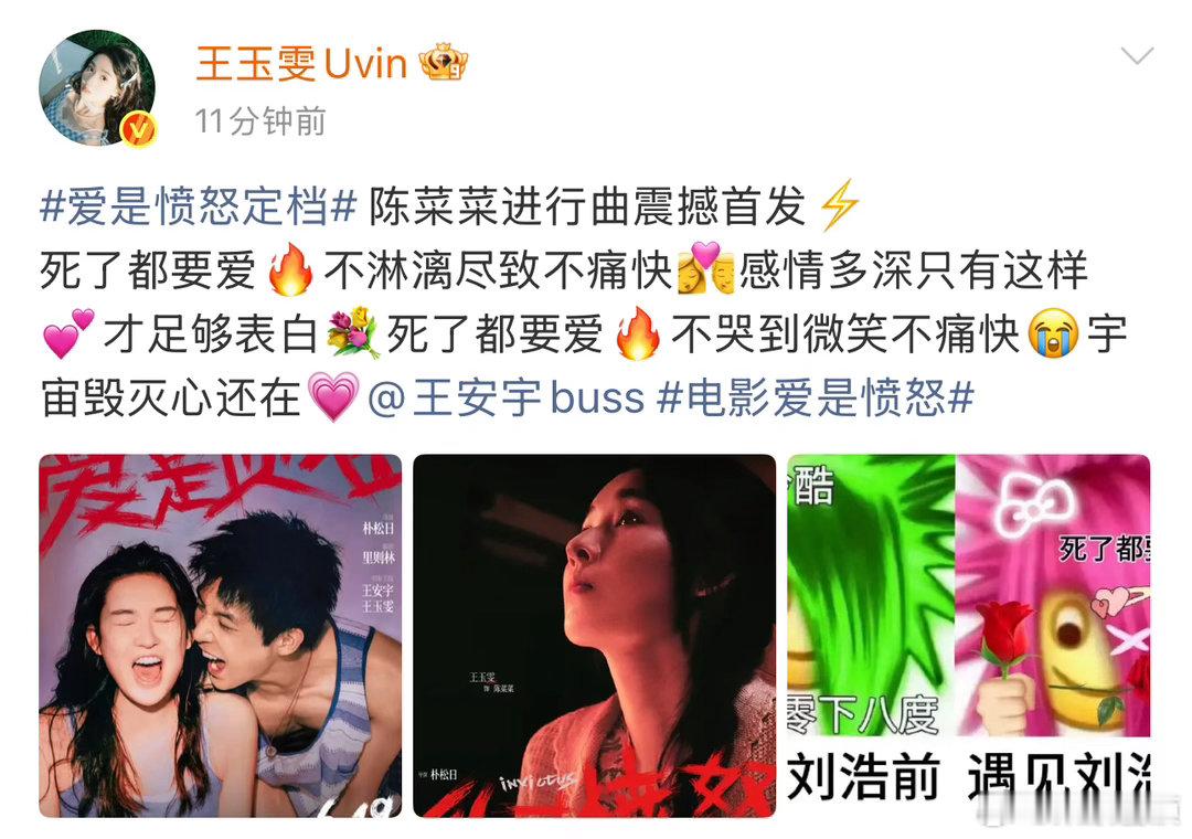 王安宇王玉雯吵到我眼睛了 谁又惹他俩高兴了王安宇、王玉雯两人的宣发博文明明没有声音、但是就感觉好吵,《爱是愤怒》定档必须尝尝咸淡!!