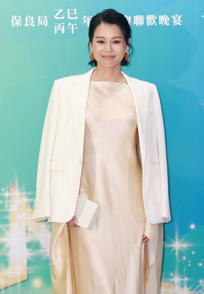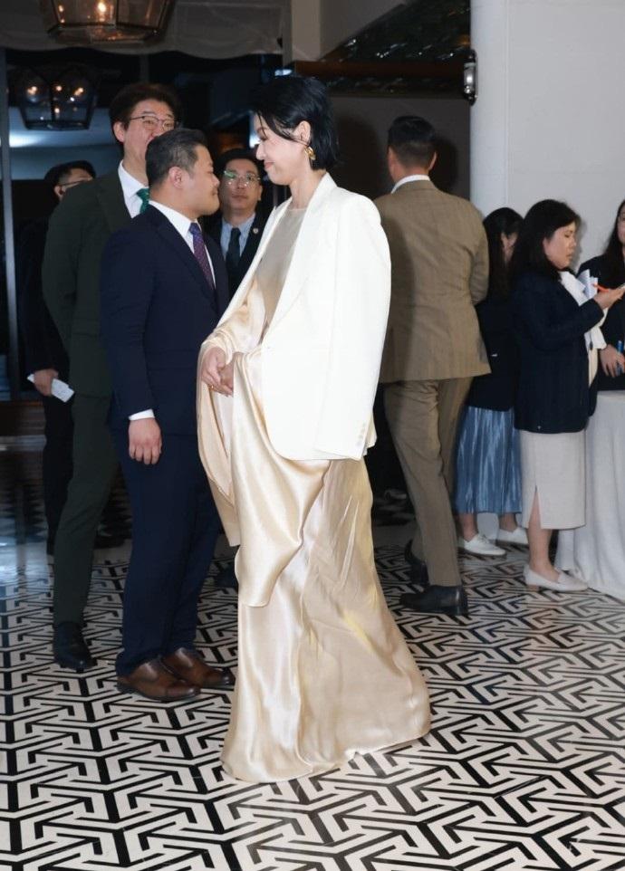 胡杏儿里面穿银色的绸缎装,外面套着白色的西装,两件衣服叠穿起来显得很有层次感,也超有华丽范儿。