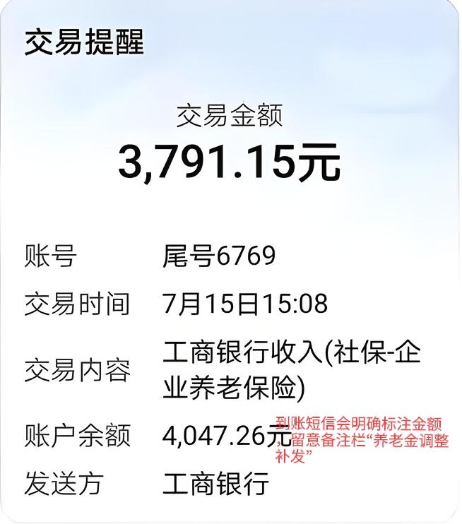 2. 看短信:很多银行会发入账提醒,注意看备注栏写的是“养老金调整补发”。