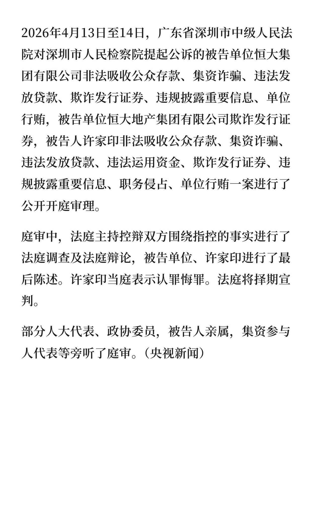 许家印这出大戏,这两天(4月13-14日)在深圳中院算是演到高潮了。说白了,就是恒大和他本人被控一堆重罪,庭审上老许没再硬扛,直接认怂了。