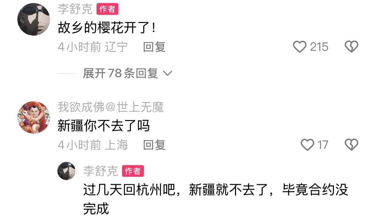 李舒克发文故乡的樱花开了,新疆不陪恩师去了,过几天去杭州。