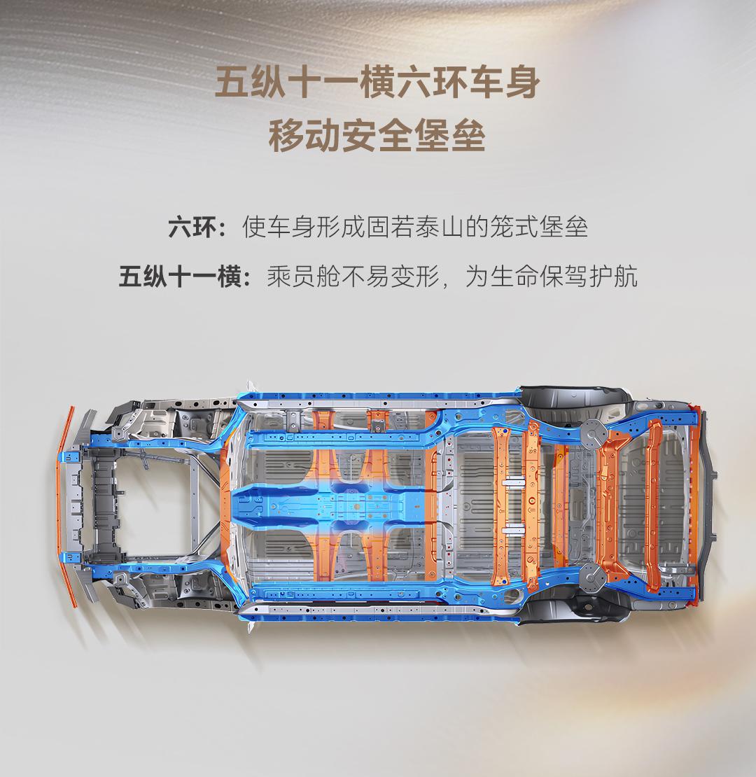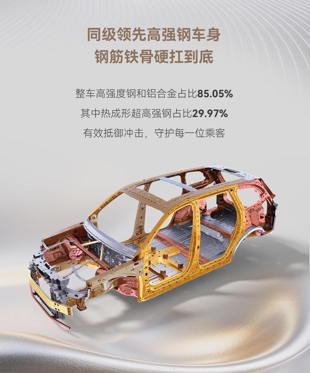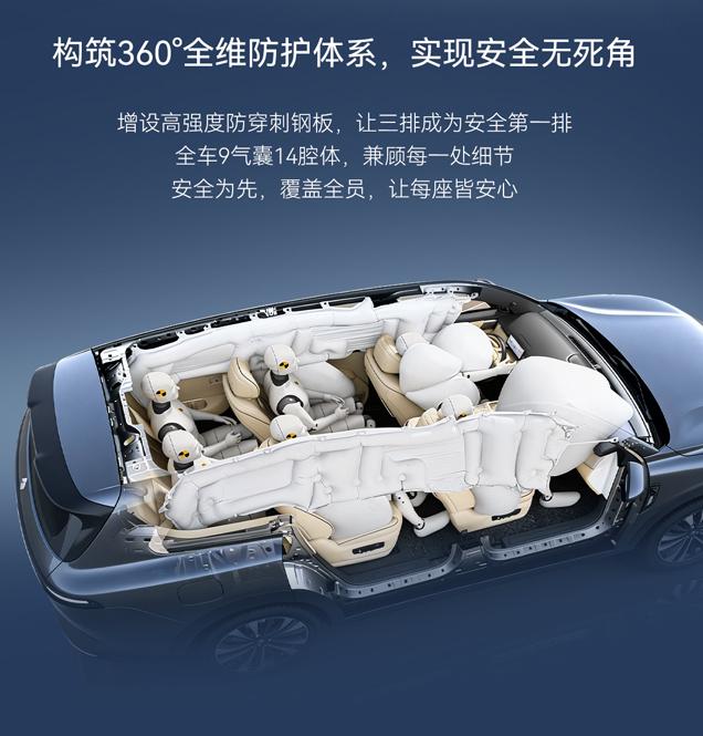 它的被动安全堪称“钢筋铁骨”,车身采用2000MPa核潜艇级超高强钢,搭配全球首创一体式热成型前地板骨架,车顶能扛住11.7吨重压。第三排座椅背部特意加装高强度防穿刺钢板,9气囊14腔体矩阵全方位覆盖,真正实现全员平等守护。
