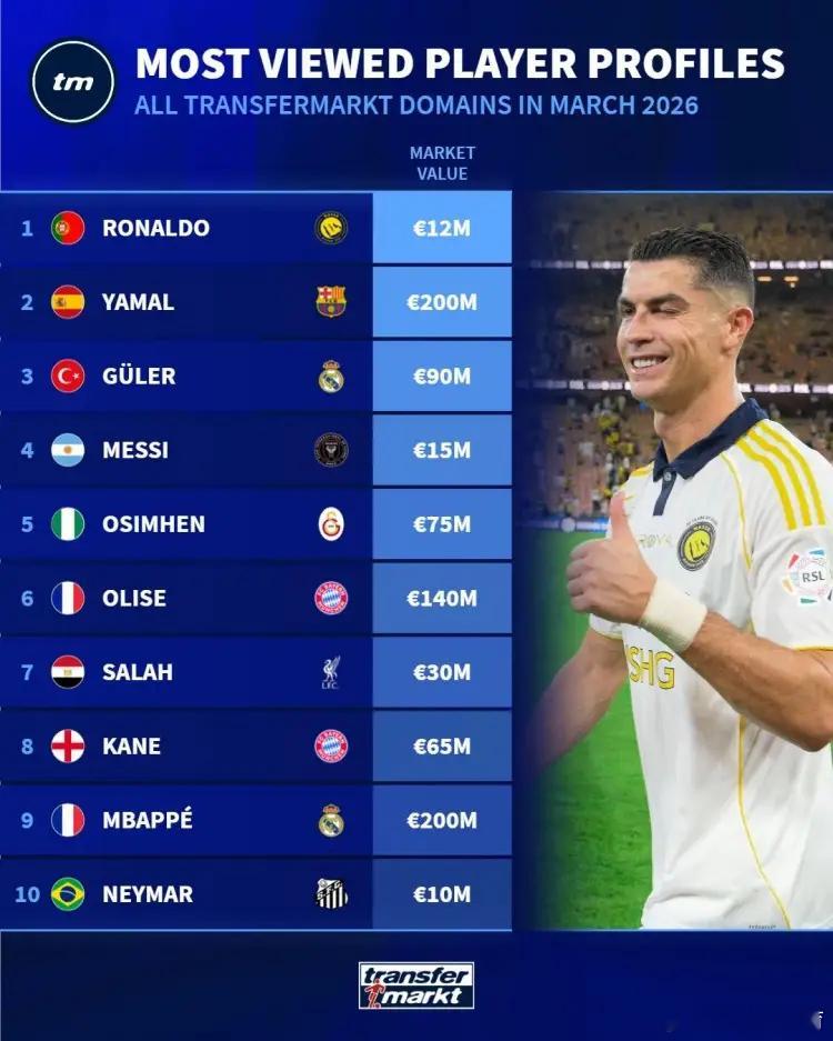 德国转会市场列出了3月份球员页面浏览量排名,C罗居首,亚马尔、居莱尔、梅西前四。沙特联葡萄牙