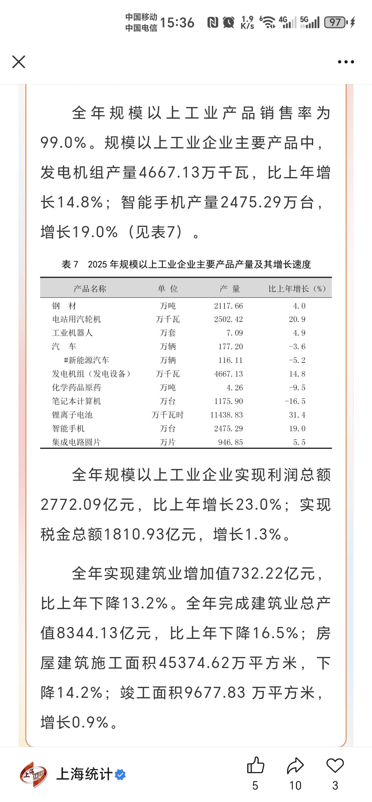 1-2月上海的手机制造业开始发力了,真的是可喜可贺呀!2025年上海市智能手机产量超过了2475万部,同比增长了19%,要知道2025年上海市的规模以上工业总产值也不过4万亿,同比增长也仅有5%,这说明智能手机制造业给上海市工业和制造业的稳增长起到了极大的推动作用,这个是今天上海市统计局发布的2025年上海经济统计公报上的数据,另外2025年上海市汽车产量约177万辆,同比下降了约3.6%其中新能源汽车产量同比下降了约5.2%。