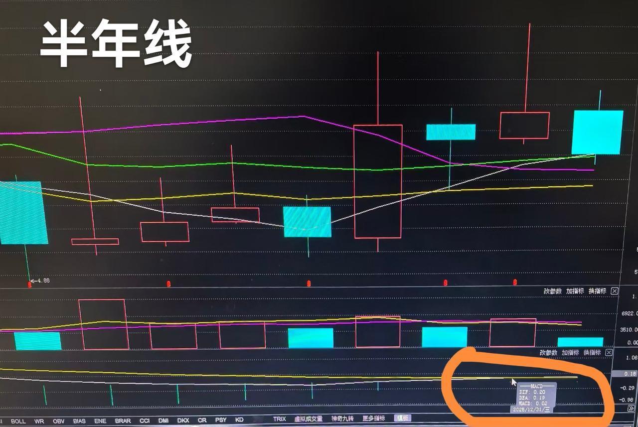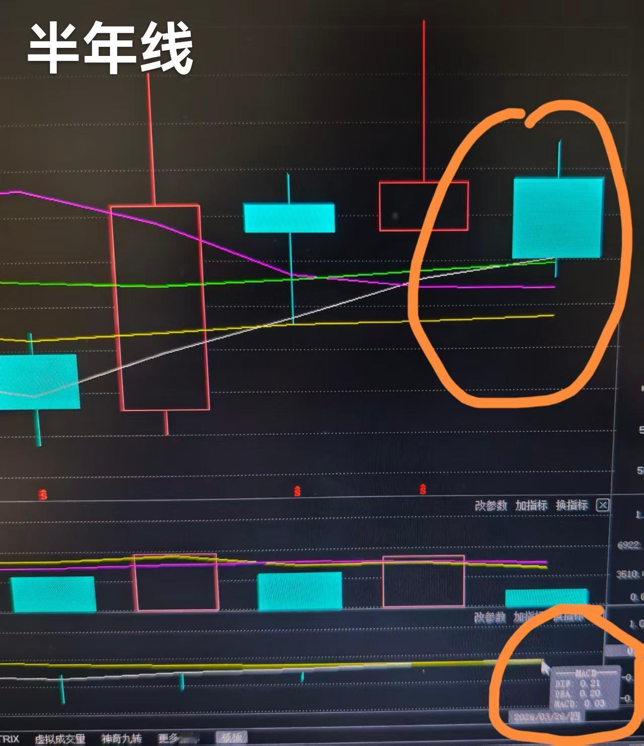 聚焦半年线MACD,去年下半年数值仅0.02,历经三个月深度调整后,当前MACD数值升至0.03,呈现向上抬升态势;DIF与DEA形成金叉并持续向上,DIF从去年0.20升至0.21,DEA 从0.19升至0.20,双线同步上行,这代表大周期仍然强势。