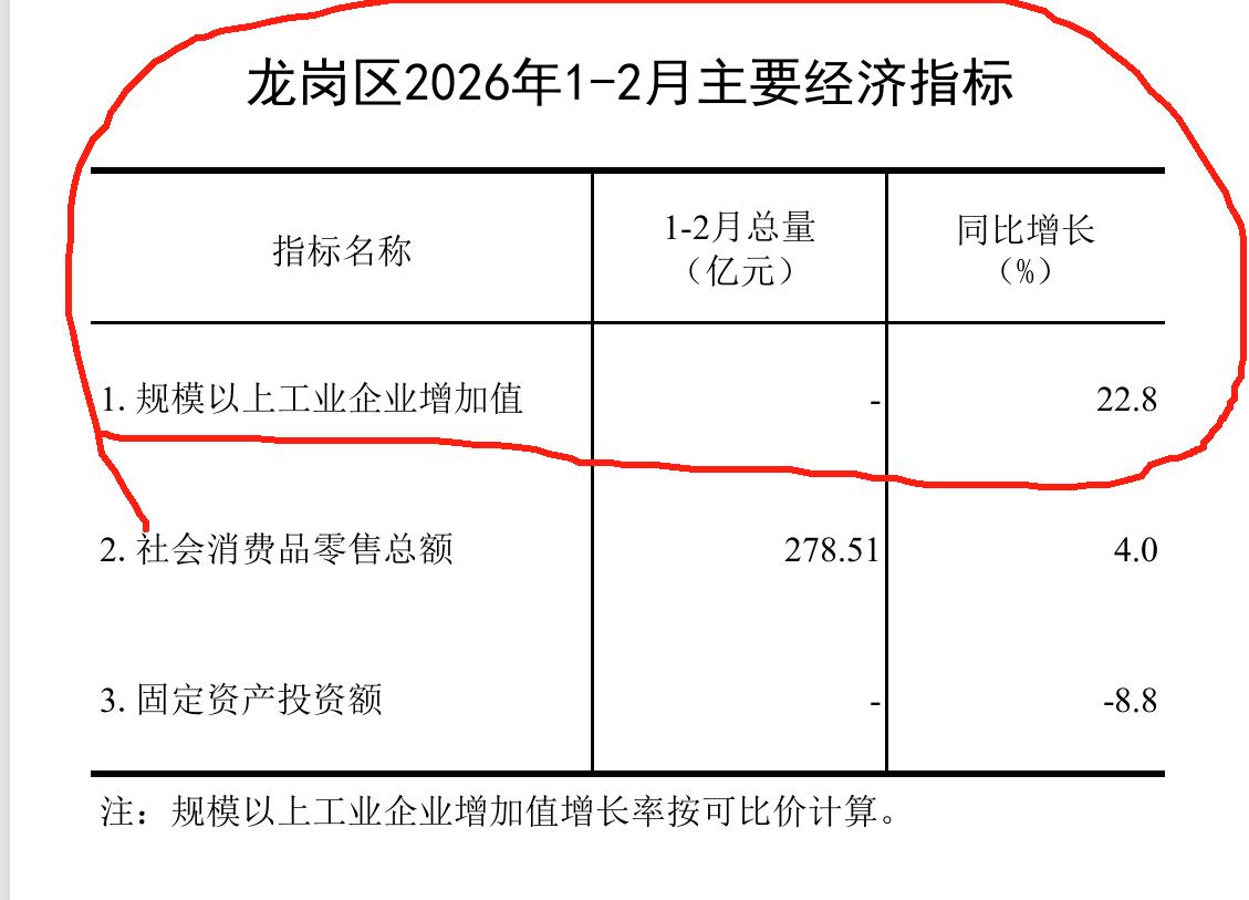 发现没?2026年1-2月深圳龙岗区规模以上工业增加值大爆发,同比增长了22.8