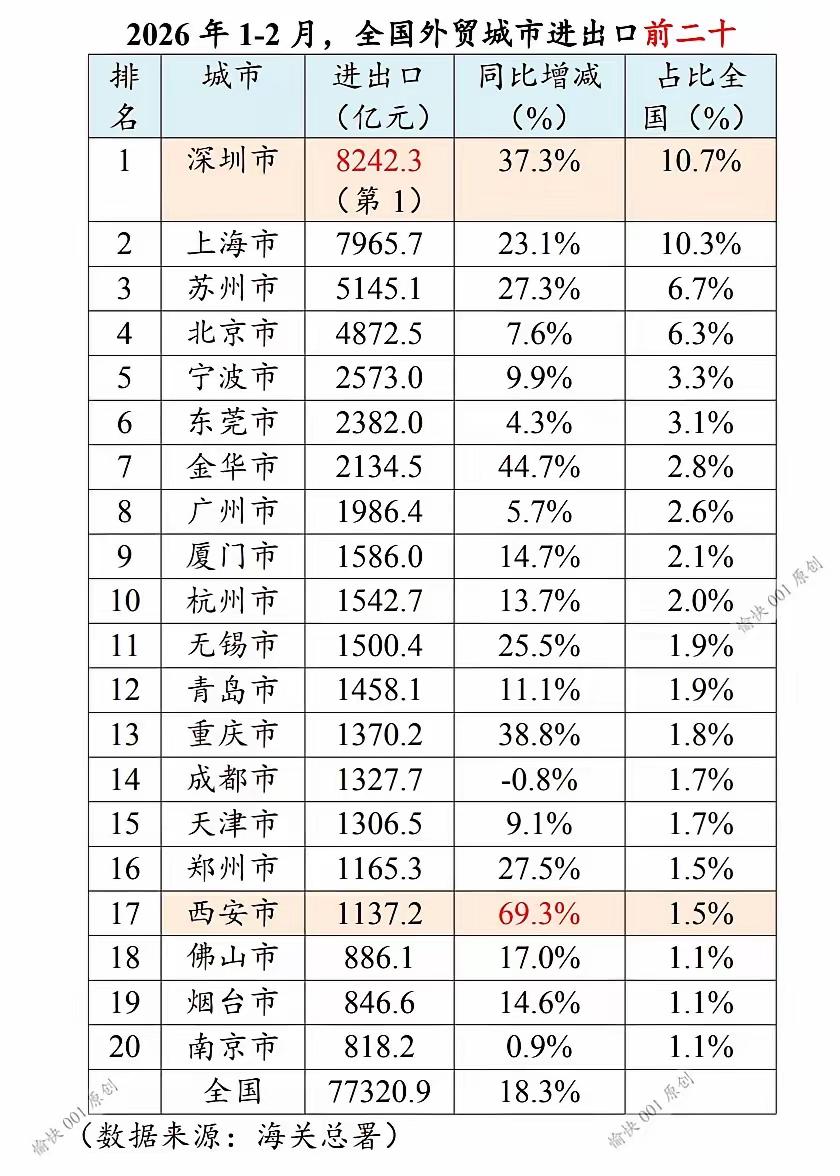 前两个月深圳外贸超8242亿大涨37.3%!2026年1-2月深圳再次拿下中国外贸货物进出口总额第一城的桂冠!