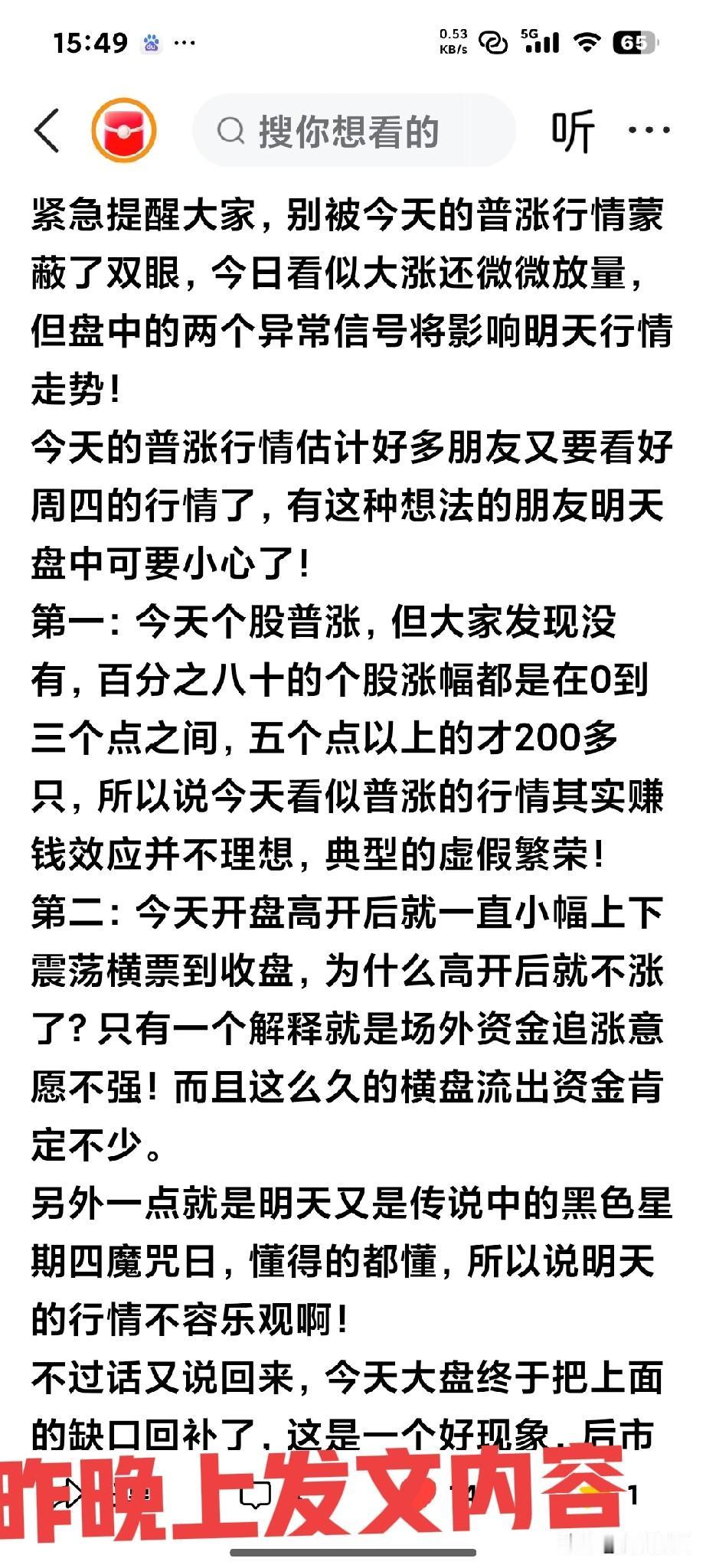 昨天晚上就发文说了周三的普涨行情就是虚假繁荣,也提示了几个不好的异常信号,提醒看多的朋友不要被昨天的普涨冲昏头脑,今天要小心应对了。今天早盘果不其然大盘低开低走直到中午收盘,基本符合我的预判,今天中午又发文提醒大家下午行情的应对措施!下午开盘就跳水跌破了上午的最低点后就一波比一波低,直到两点后止跌企稳开始反弹,直到收盘!不知道大家有没有按照我中午说的低位补仓,等明天反弹做T,反正我是补仓了!