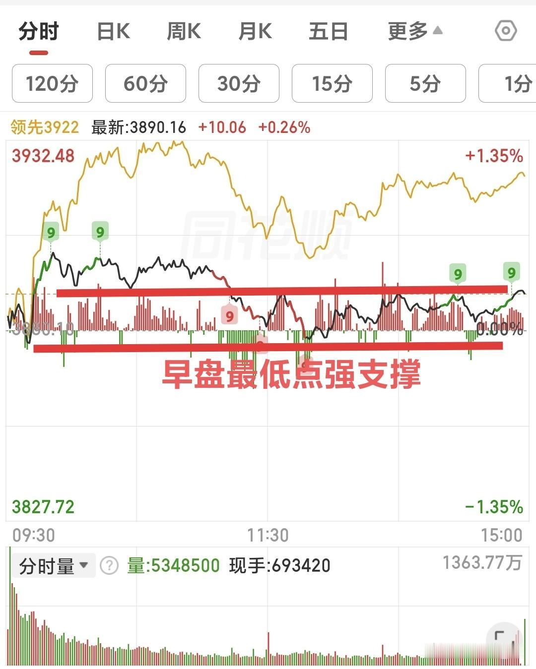 果然下午开盘往上冲一下就回落,但还是被早盘最低点支撑住了,说明主力在此位置护盘,直到收盘也没被跌破,由此看来,明天大概率还会有冲高动作!