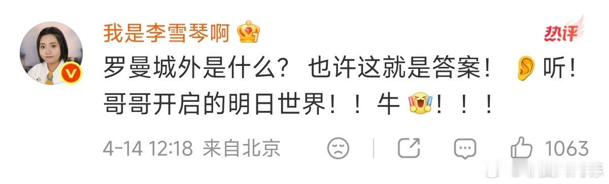 李雪琴为汪苏泷新专辑打call李雪琴为汪苏泷明日世界打call 李雪琴为汪苏泷新专辑明日世界打call:“罗曼城外是什么? 也许这就是答案! ?听! 哥哥开启的明日世界!!牛 !!! ”