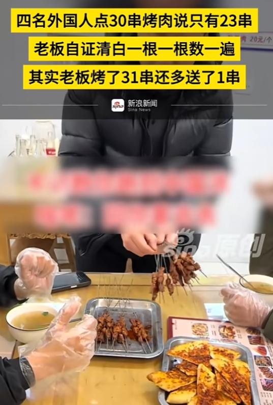 老板做餐饮多年,一向实在,怕客人觉得数量不对,每单都会习惯性多烤一串送给顾客,这次也不例外,端上桌的实际是31串,比点单的30串还要多一串。面对留学生的质疑,老板没有争执,也没有不耐烦,只是平静地让他们当着自己的面再数一遍,想把问题弄清楚。