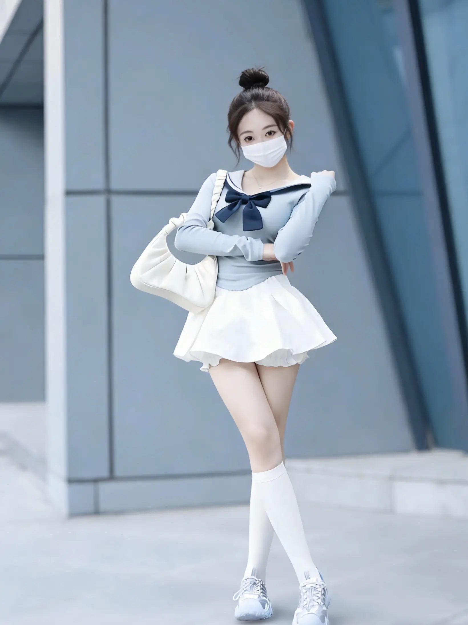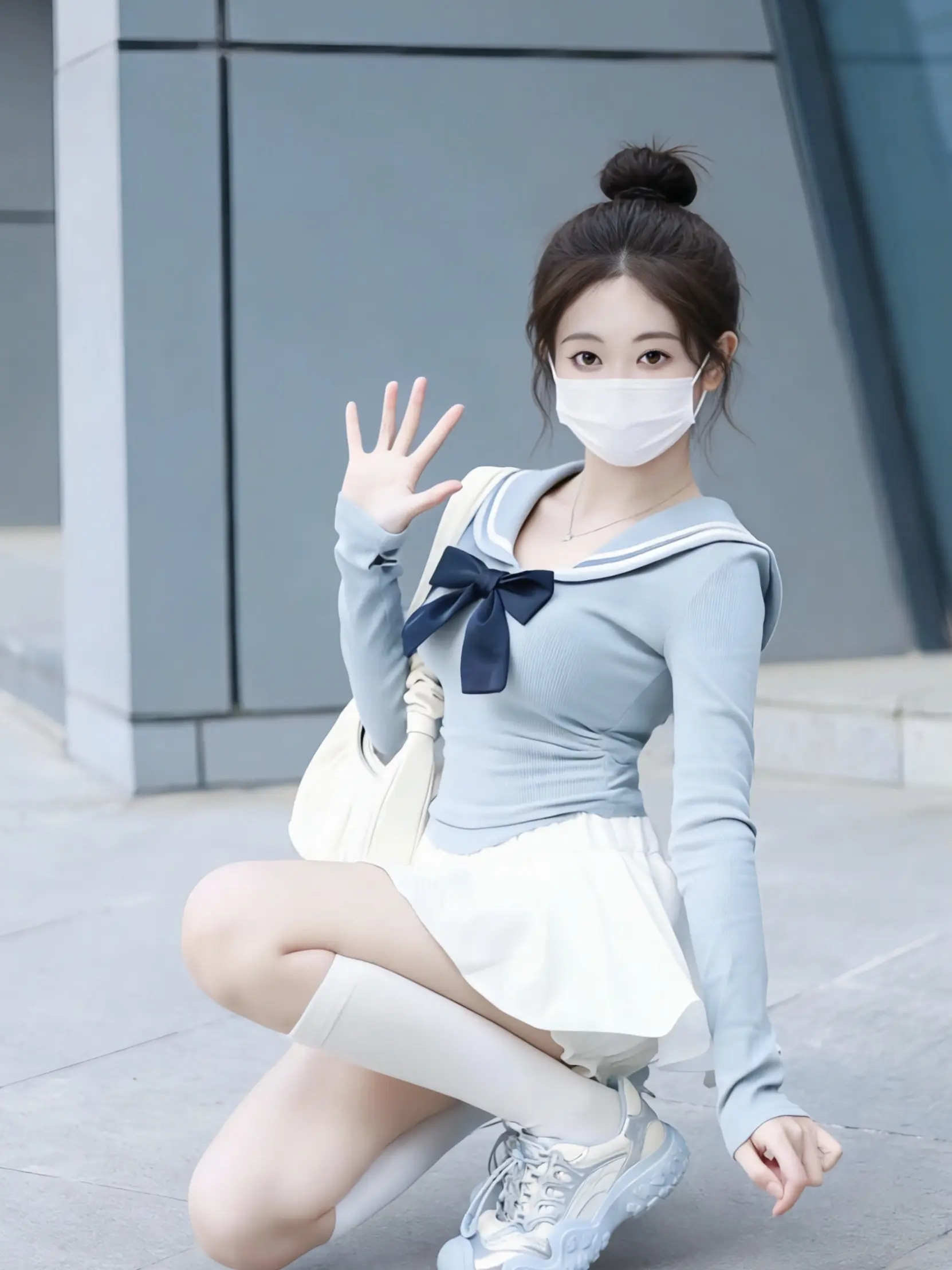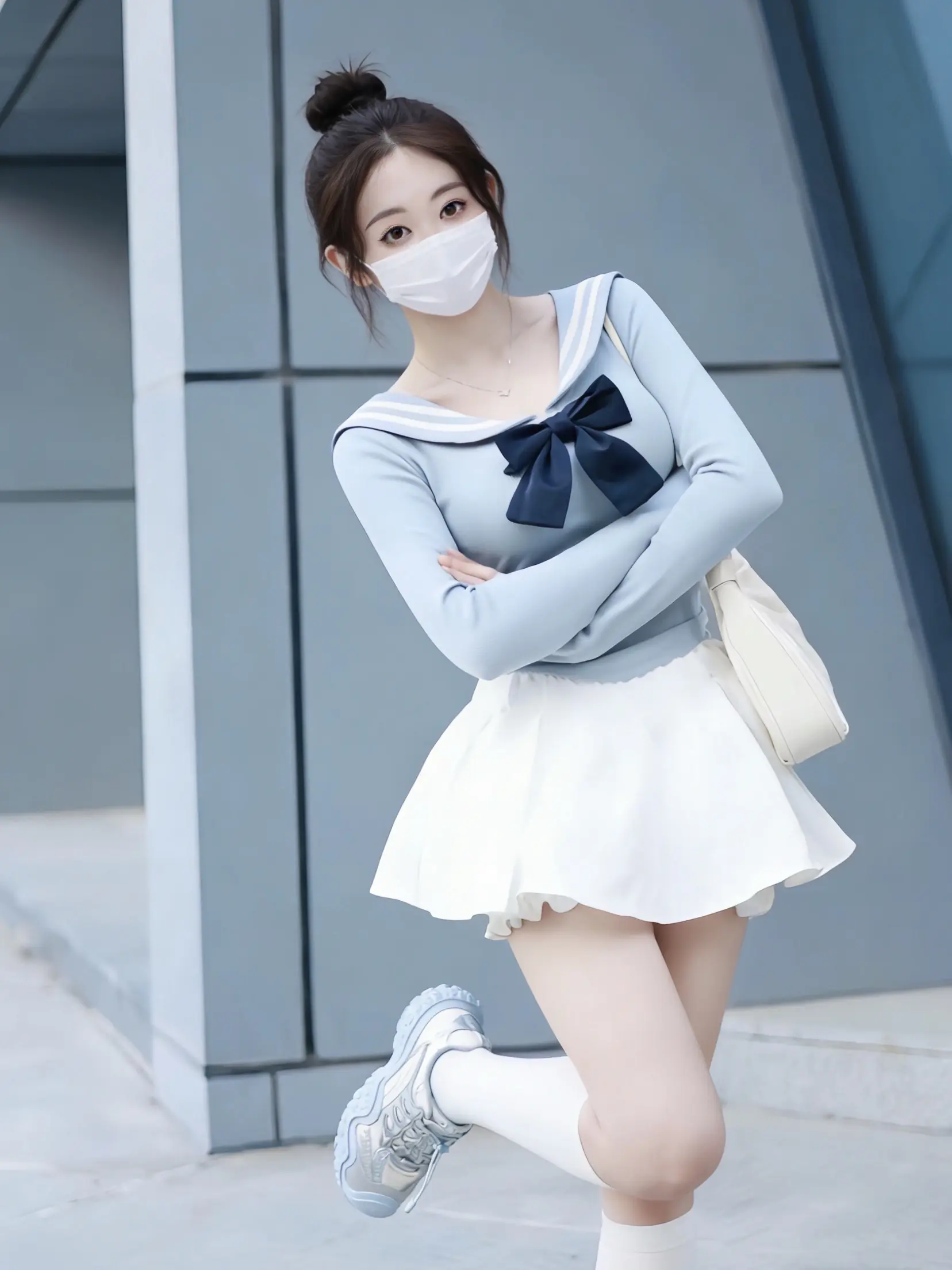 浅蓝水手领+藏青大蝴蝶结,温柔又乖巧,收腰版型超显身材,搭配白色蓬蓬短裙,清纯感直接拉满~