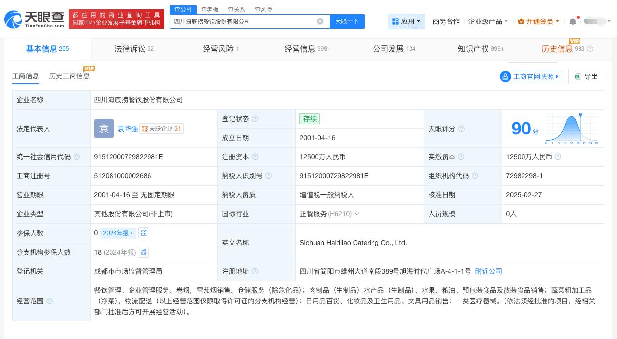 天眼查App显示,海底捞关联主体四川海底捞餐饮股份有限公司成立于2001年4月,法定代表人为袁华强,注册资本1.25亿人民币,经营范围含餐饮管理、企业管理服务、预包装食品及散装食品销售、仓储服务、物流配送等。