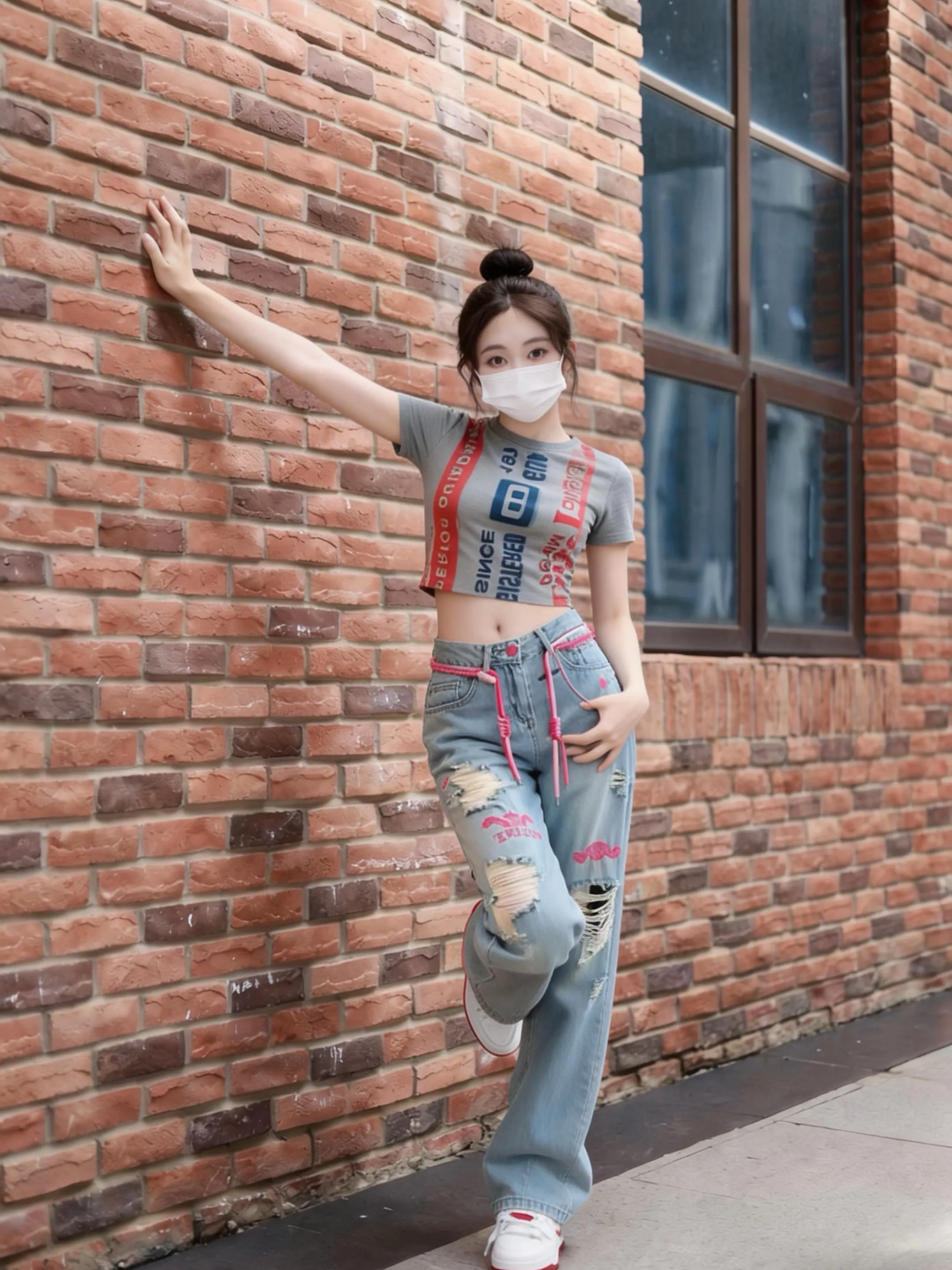 灰色短款露腰T恤+浅蓝破洞阔腿裤,