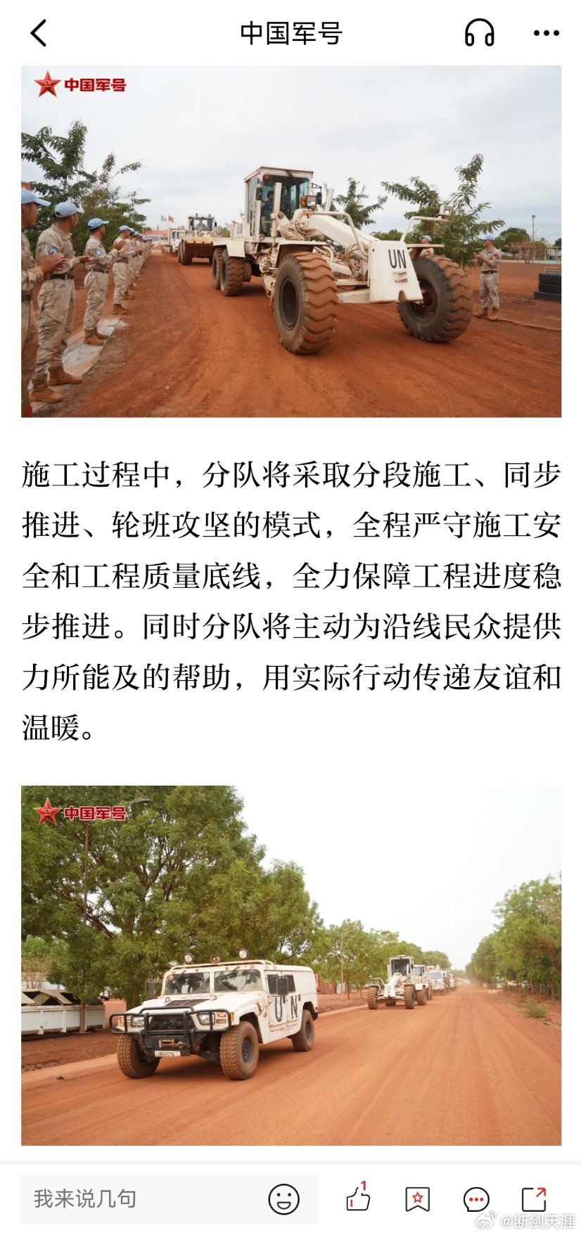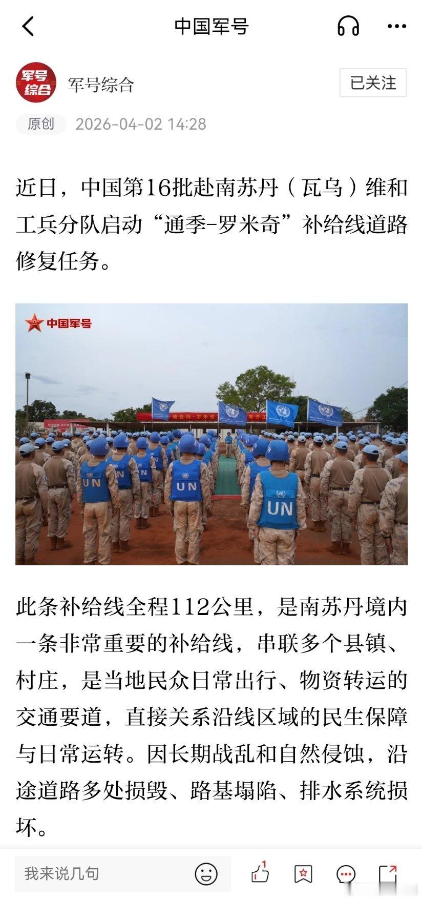 精忠蓝盔致敬中国军人致敬中国蓝盔 近日,中国第16批赴南苏丹(瓦乌)维和工兵分队启动"通季-罗米奇"补给线道路修复任务
