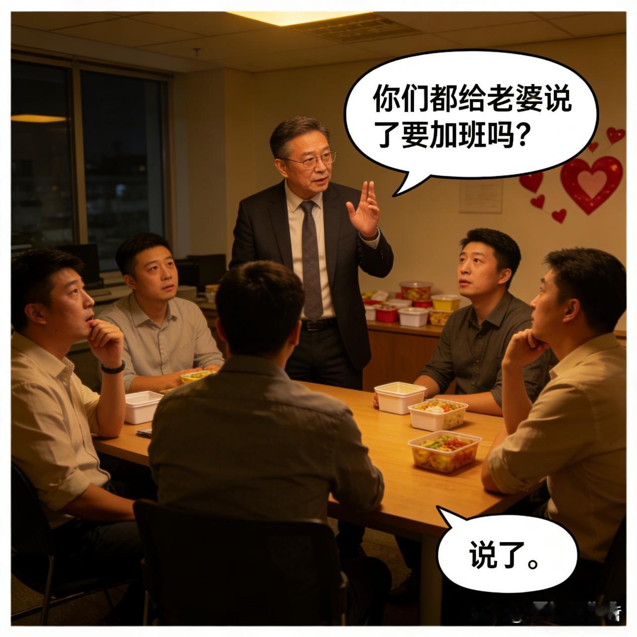在公司吃完晚饭,经理问男员工:“你们都给老婆说了要加班吗?”