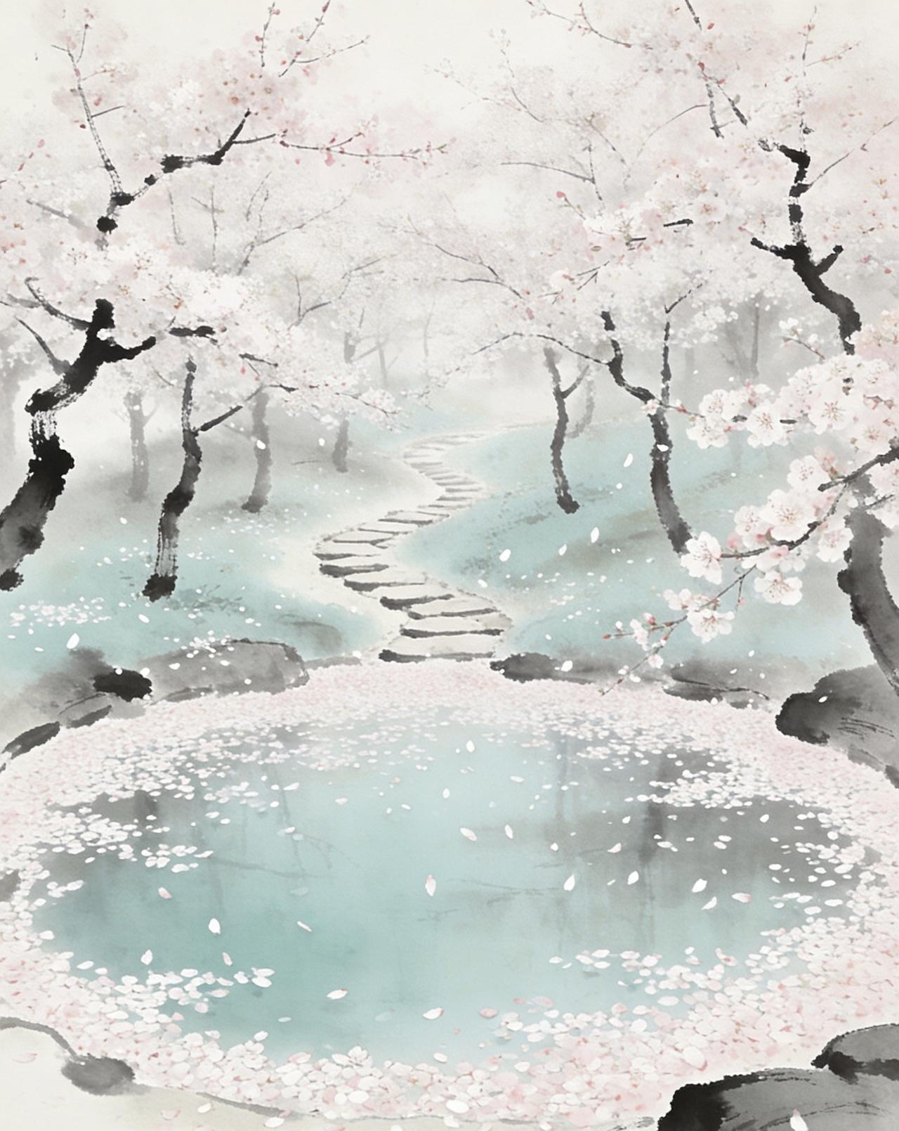 ◦ 字面意:杏花被春风吹落,花瓣纷飞如雪,飘洒在清澈的池水中。