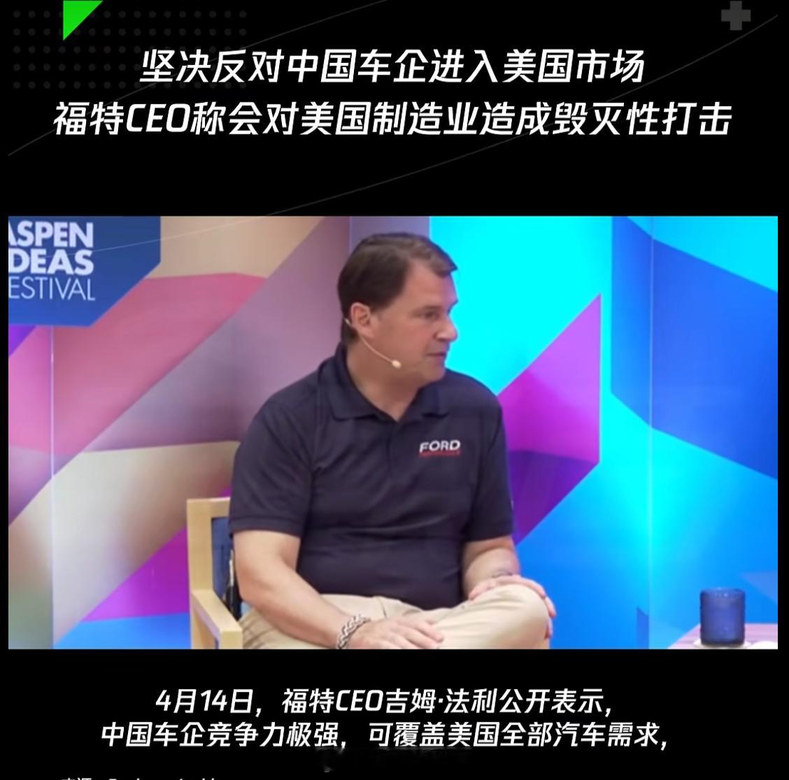 福特CEO反对中国车入美 福特CEO急了?他在福克斯新闻的节目里说了句话,原话是:我们绝不能让他们进入美国。他们是谁?中国车企。