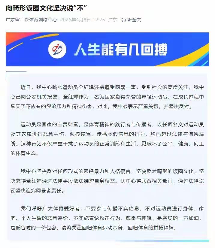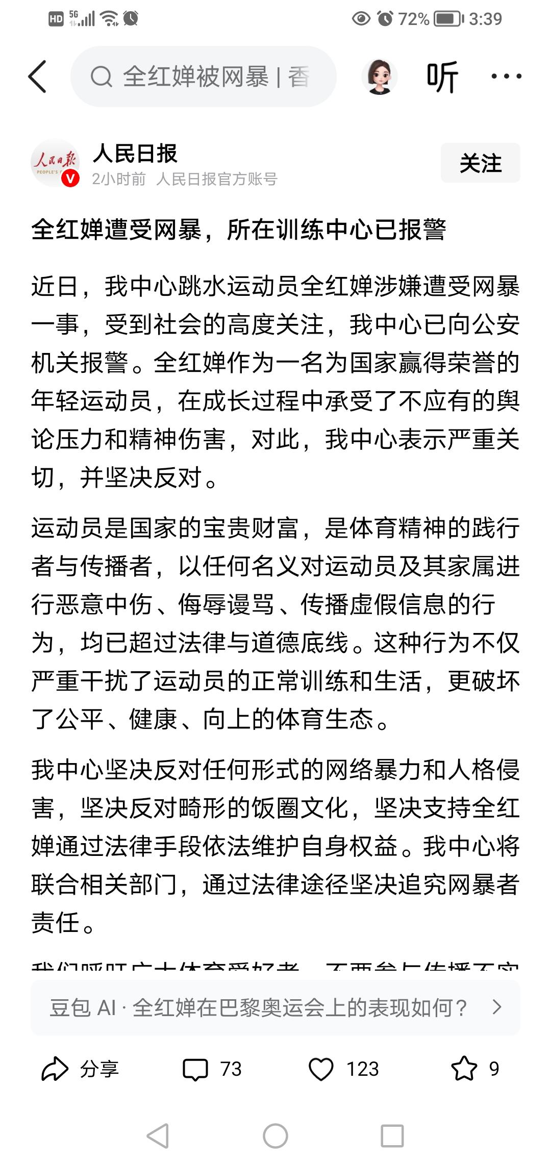 现在,全红婵已经报案,希望警方对网暴着绳之以法,以儆效尤。