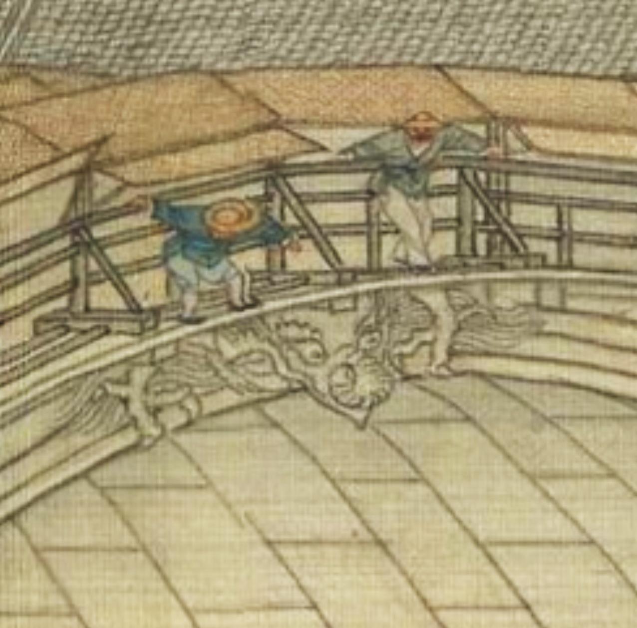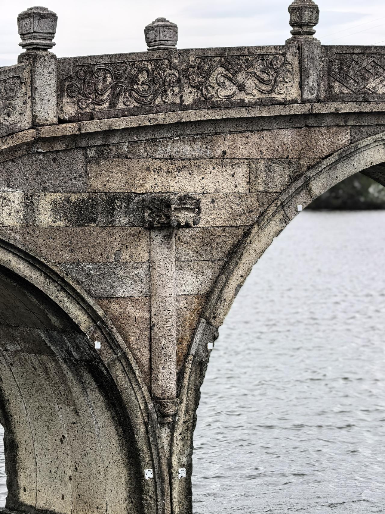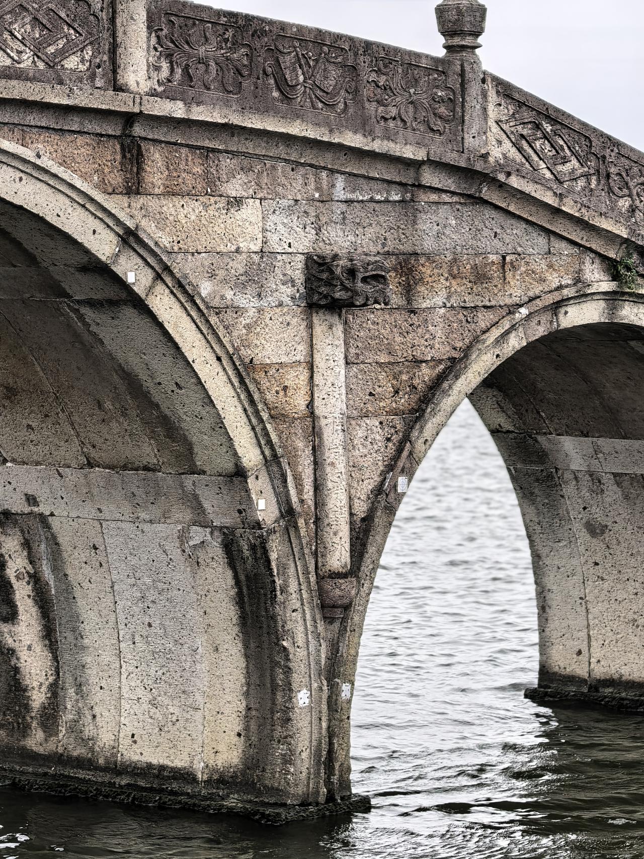 很多南方的桥梁上的避水兽建在两个桥洞之间。这是绍兴越城区泗龙桥上的避水兽,两边共
