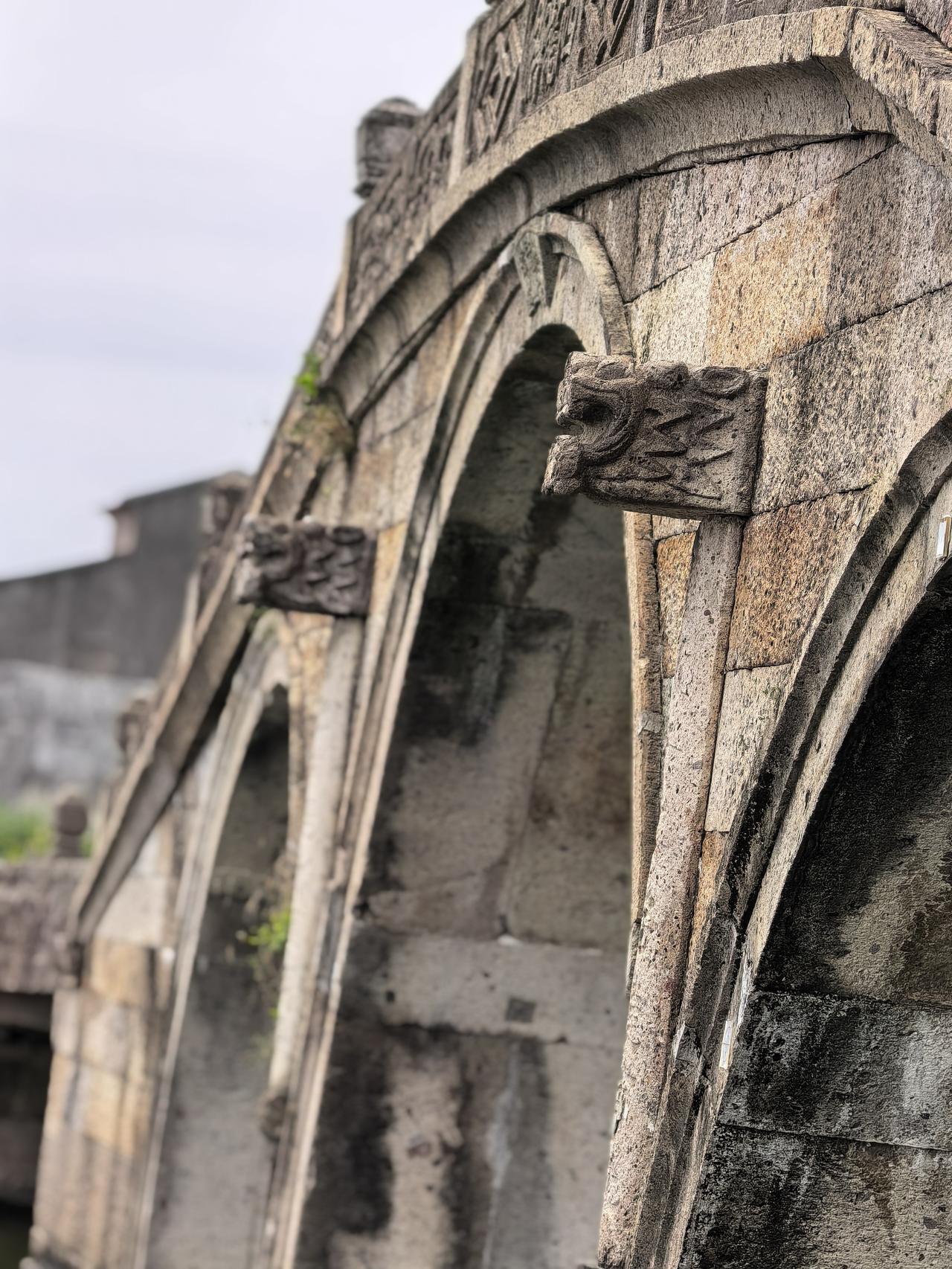 很多南方的桥梁上的避水兽建在两个桥洞之间。这是绍兴越城区泗龙桥上的避水兽,两边共有4个。