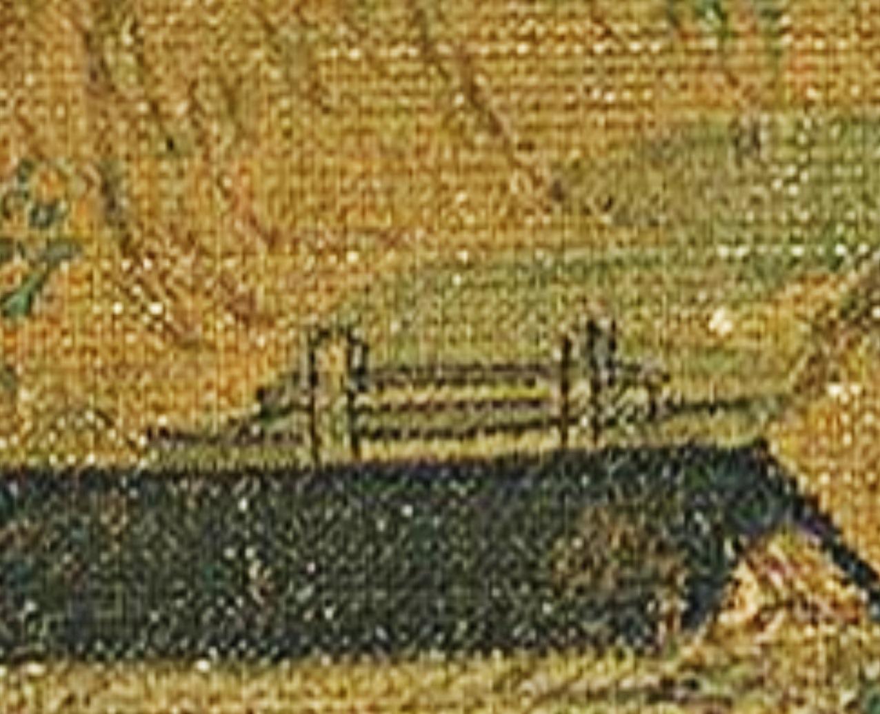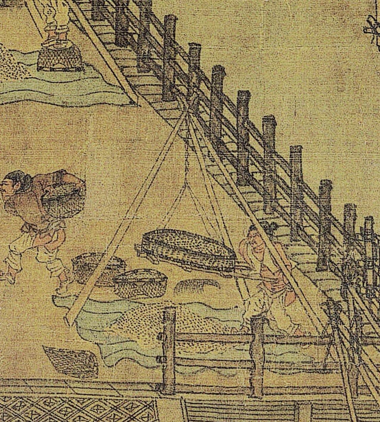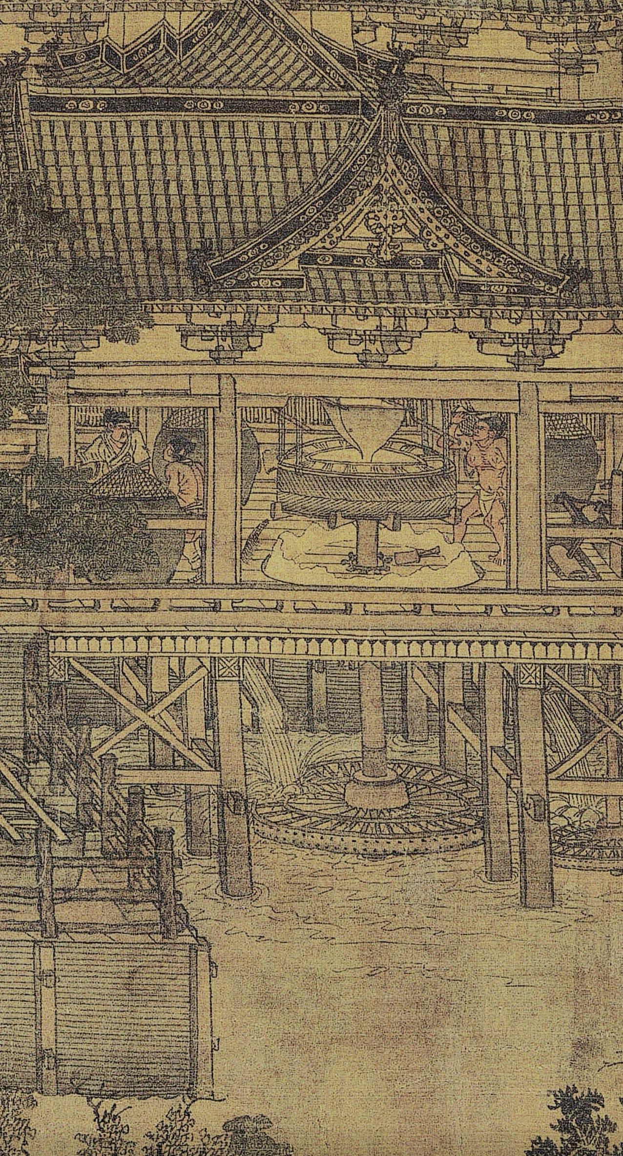 《千里江山图》中这处磨坊画得虽然是个大概,但是有些细节也画得非常认真,比如说水房上游的水闸,还有筛粮食的筛架等,都很细致,可以和上海博物馆的《闸口盘车图》对照来读,非常有意思。《闸口盘车图》 千里江山图 宋代科技