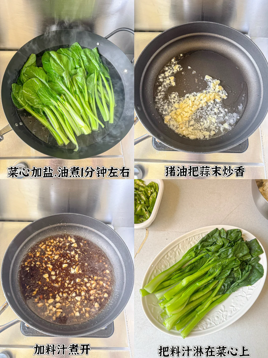 1️⃣ 锅中水开加盐、油,菜心煮1分钟左右捞出