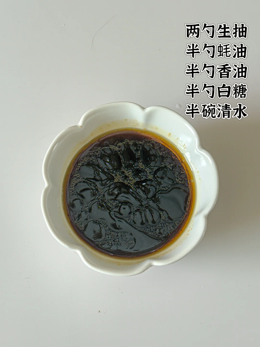 2️⃣ 调酱汁:2勺生抽+半勺蚝油+半勺香油+半勺白糖+半碗清水搅匀
