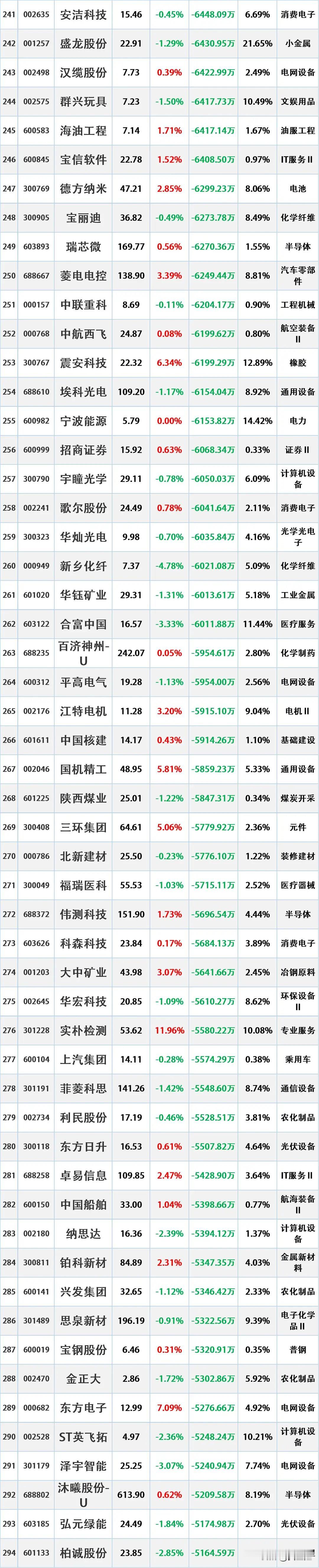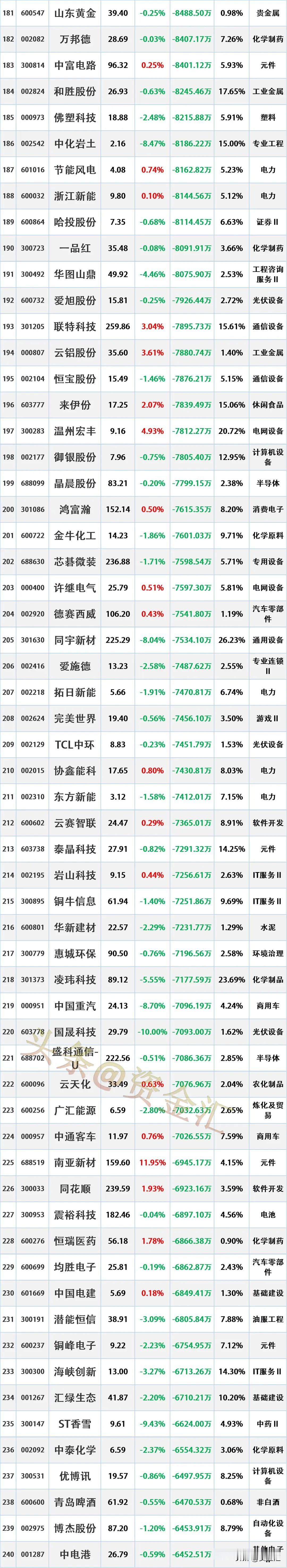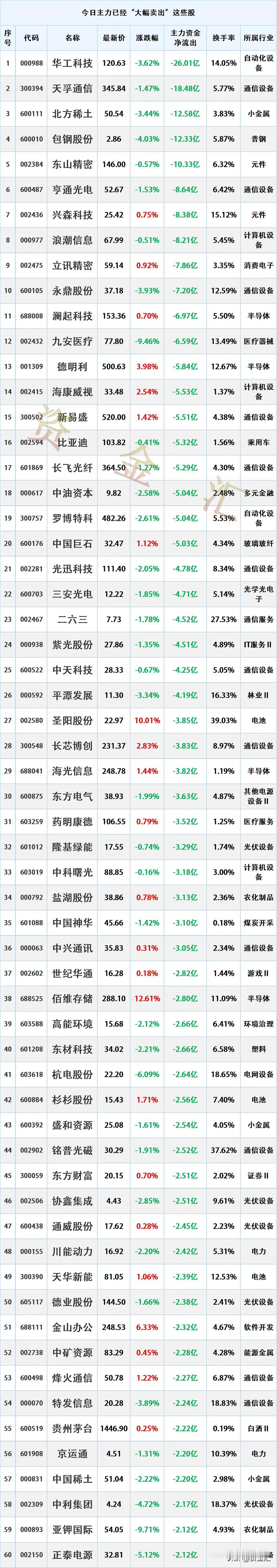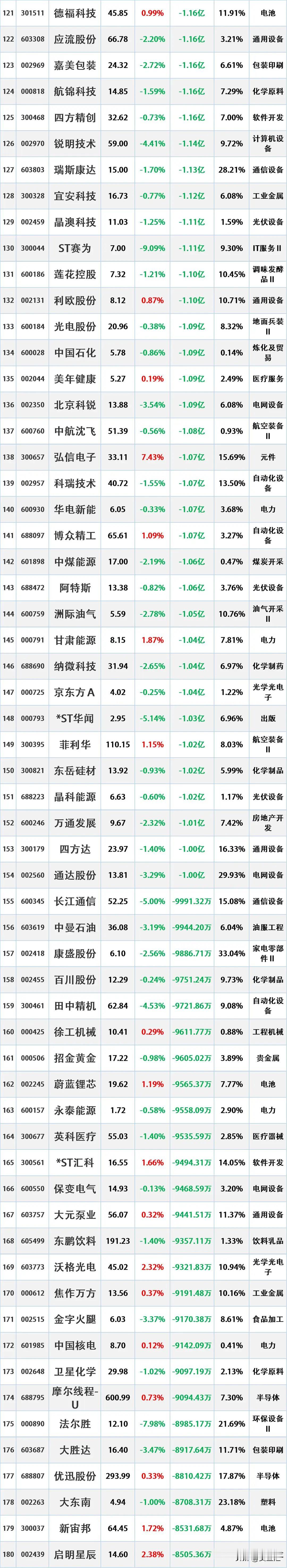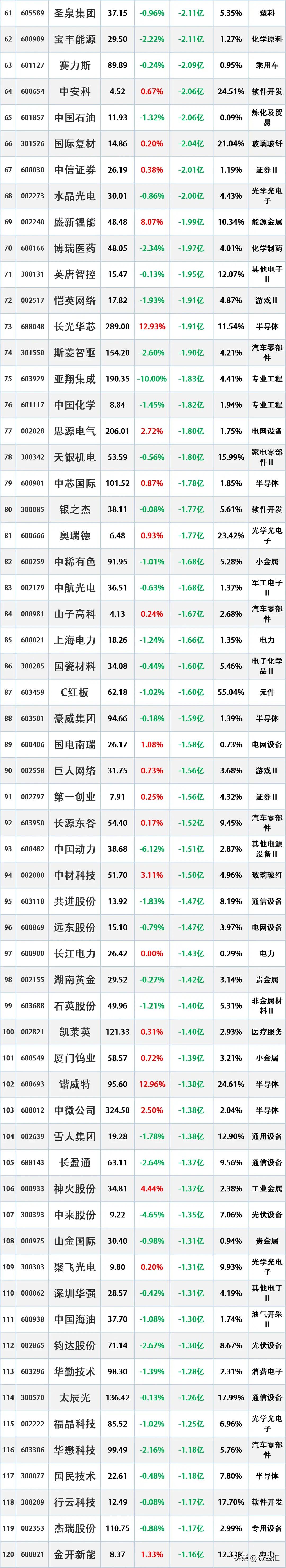 4月13日主力资金净流出前16名个股情况如下:第一名:亨通光电,主力净流出22.