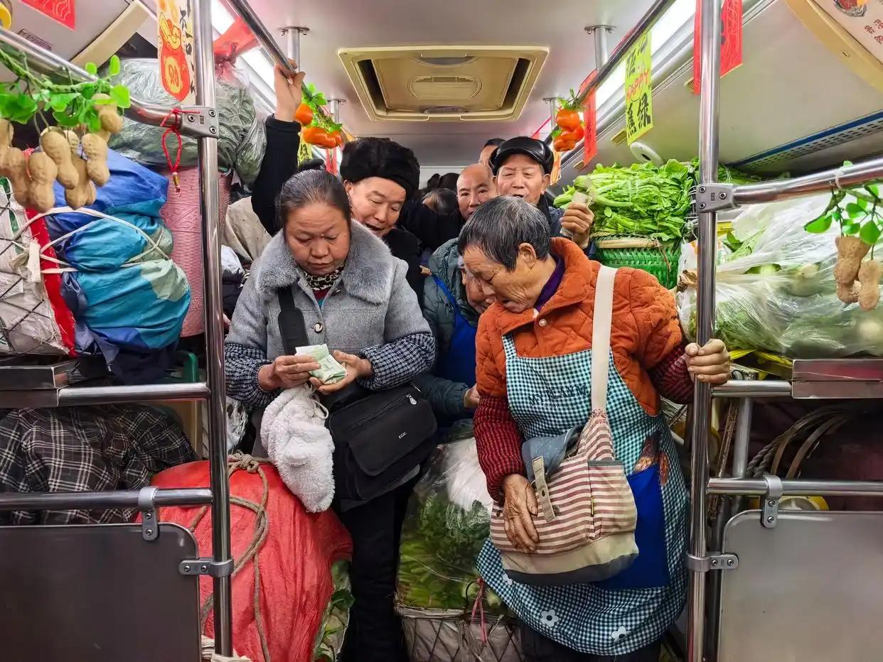 Jackson跟着上了车,一路拍到终点。沿途有老乡帮老人搬筐,有人帮着固定货物,还有人互相打听哪里的菜价更好。