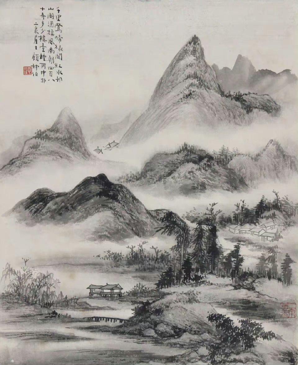 早年学土木工程的经历,让他对山石结构、空间透视把握精准。作品既有传统文人画的气韵,又有现代空间感与光影层次。
