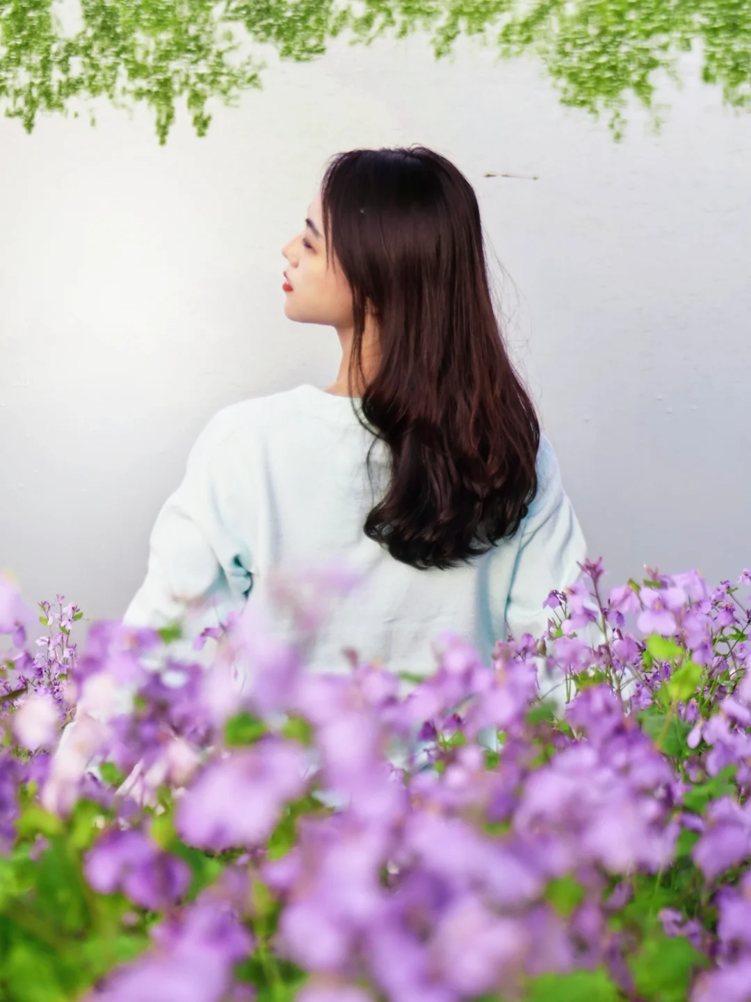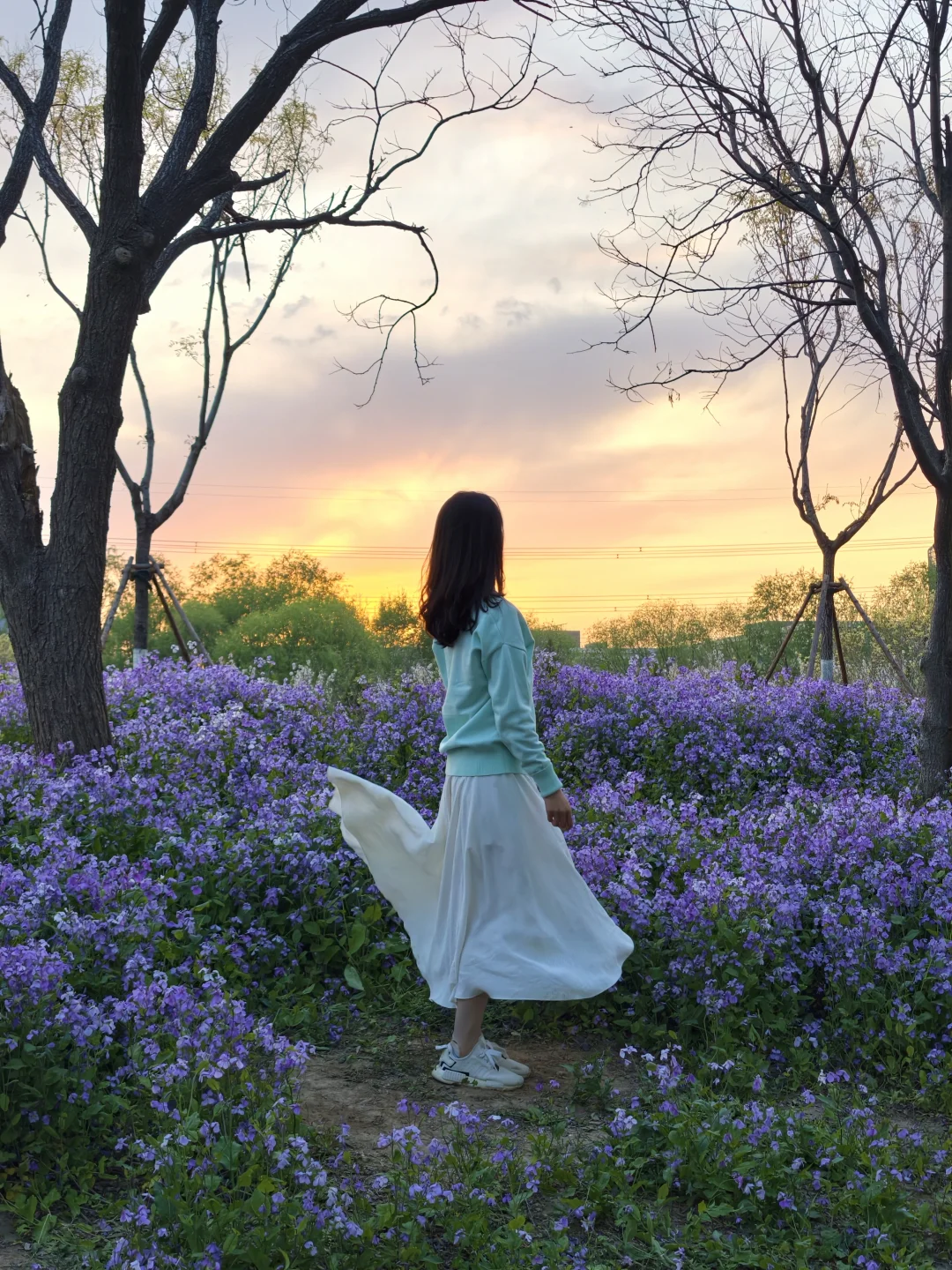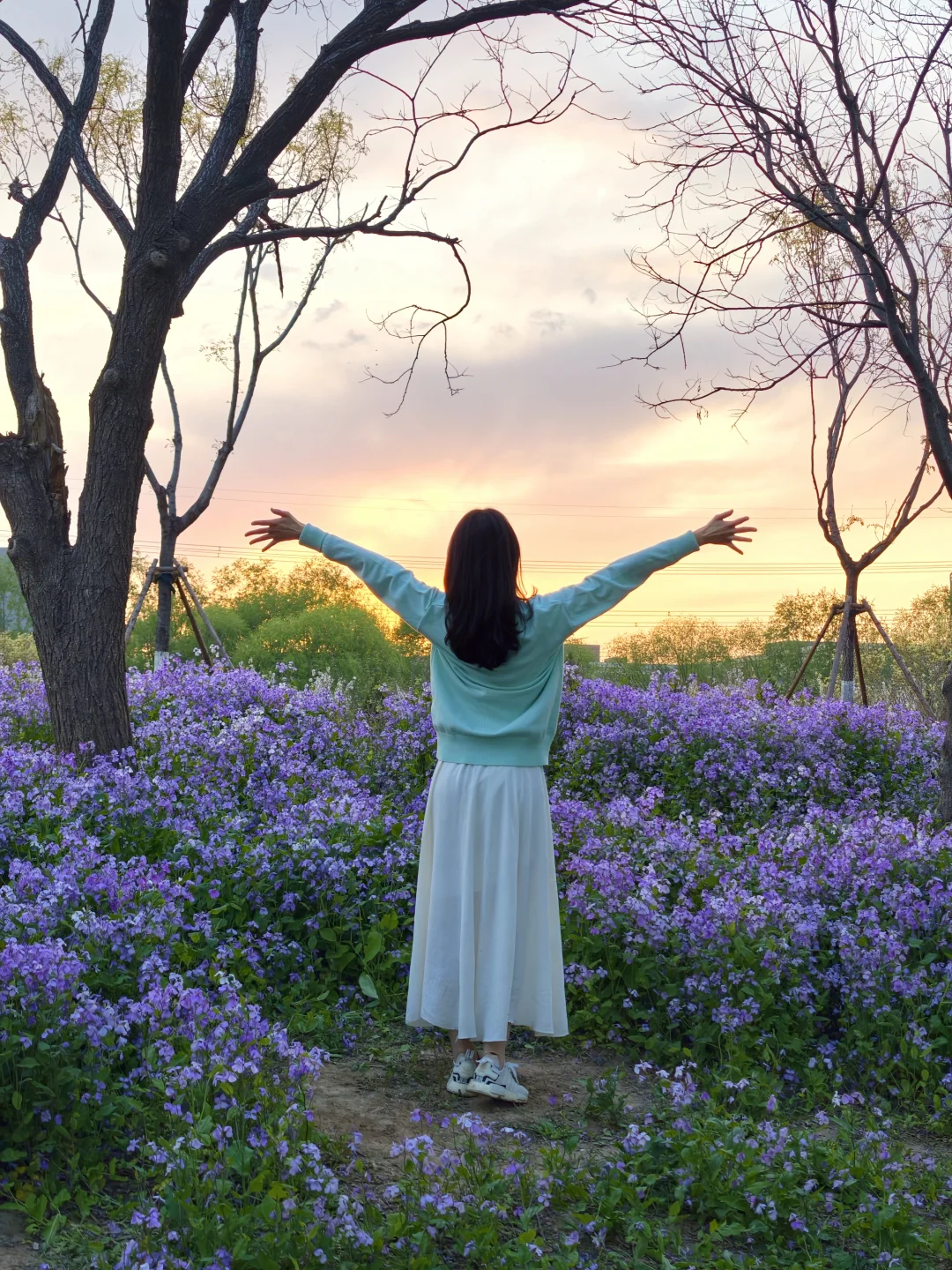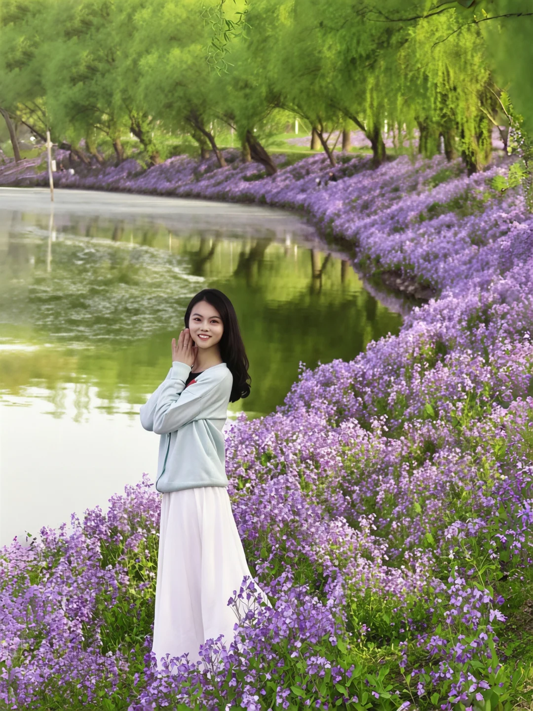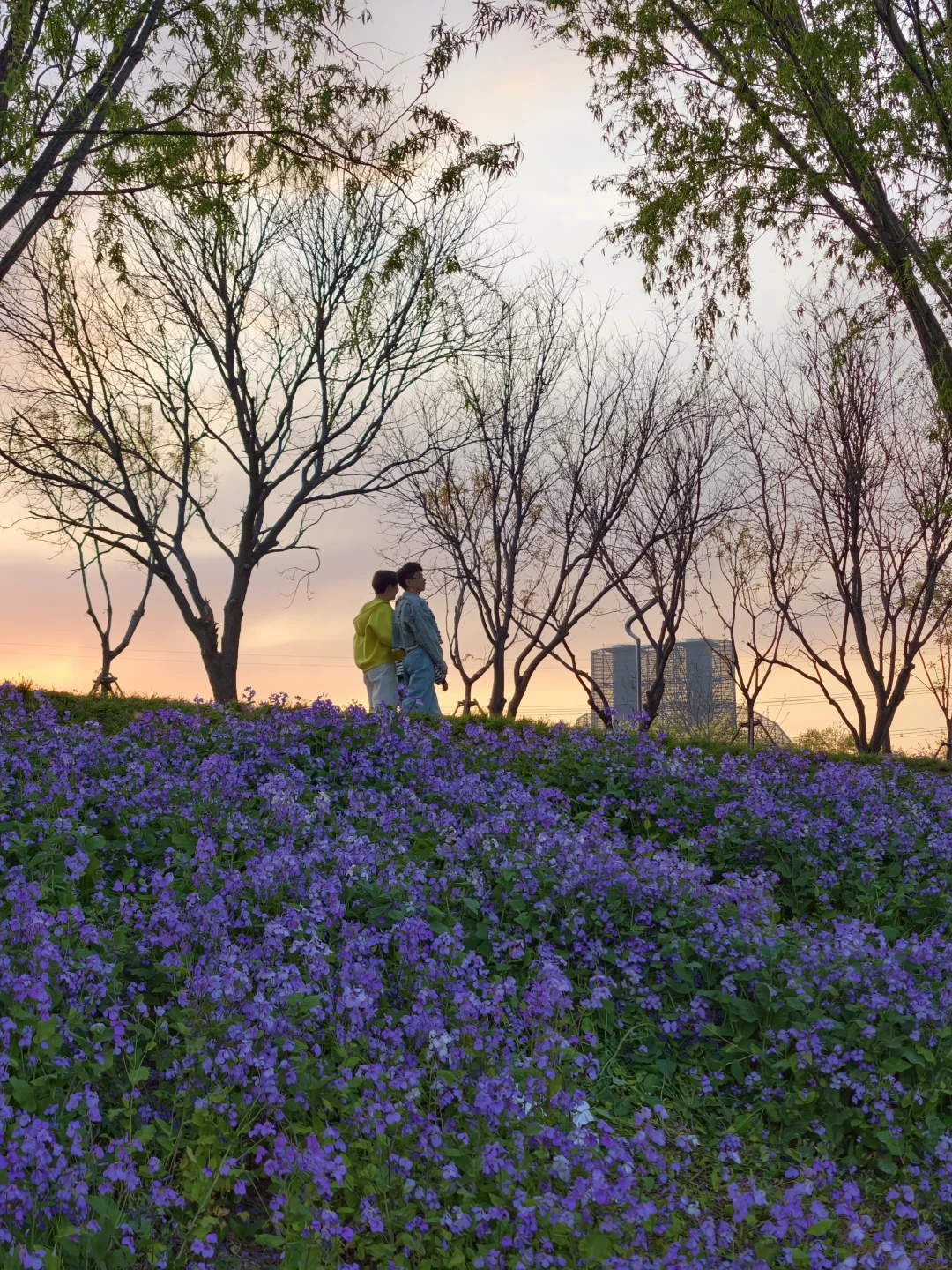 绿柳配紫花的撞色太治愈