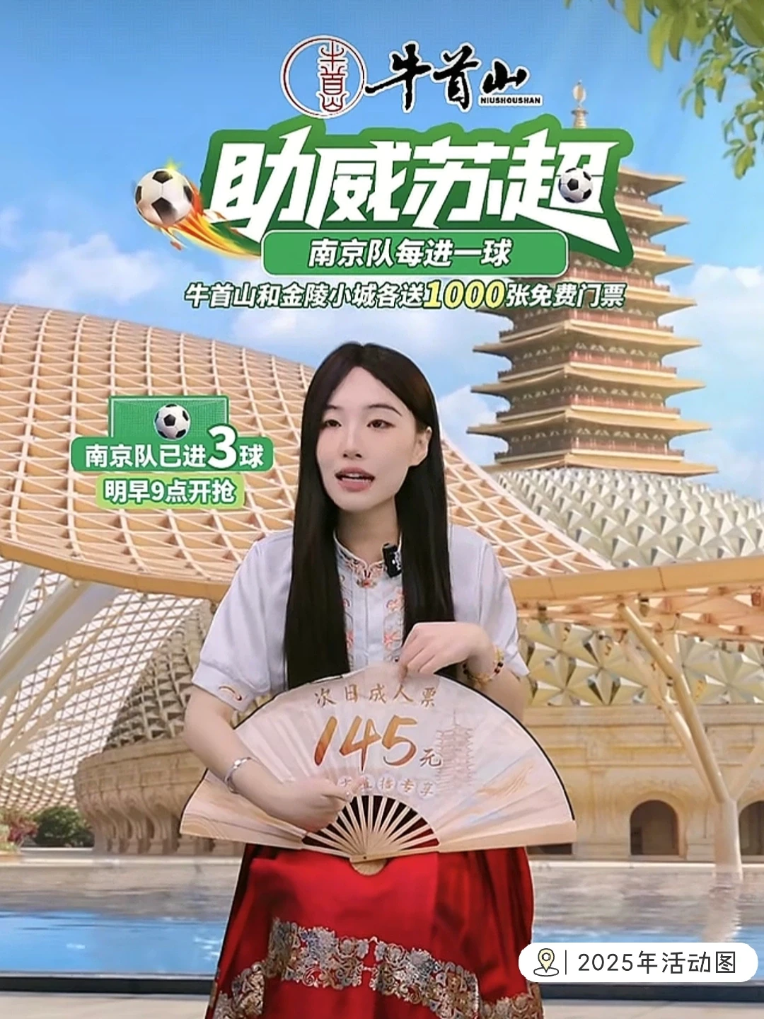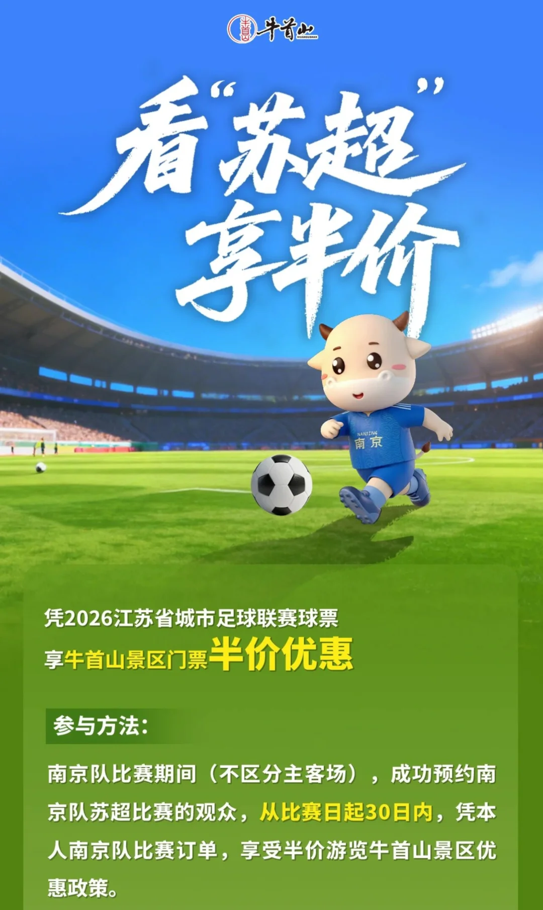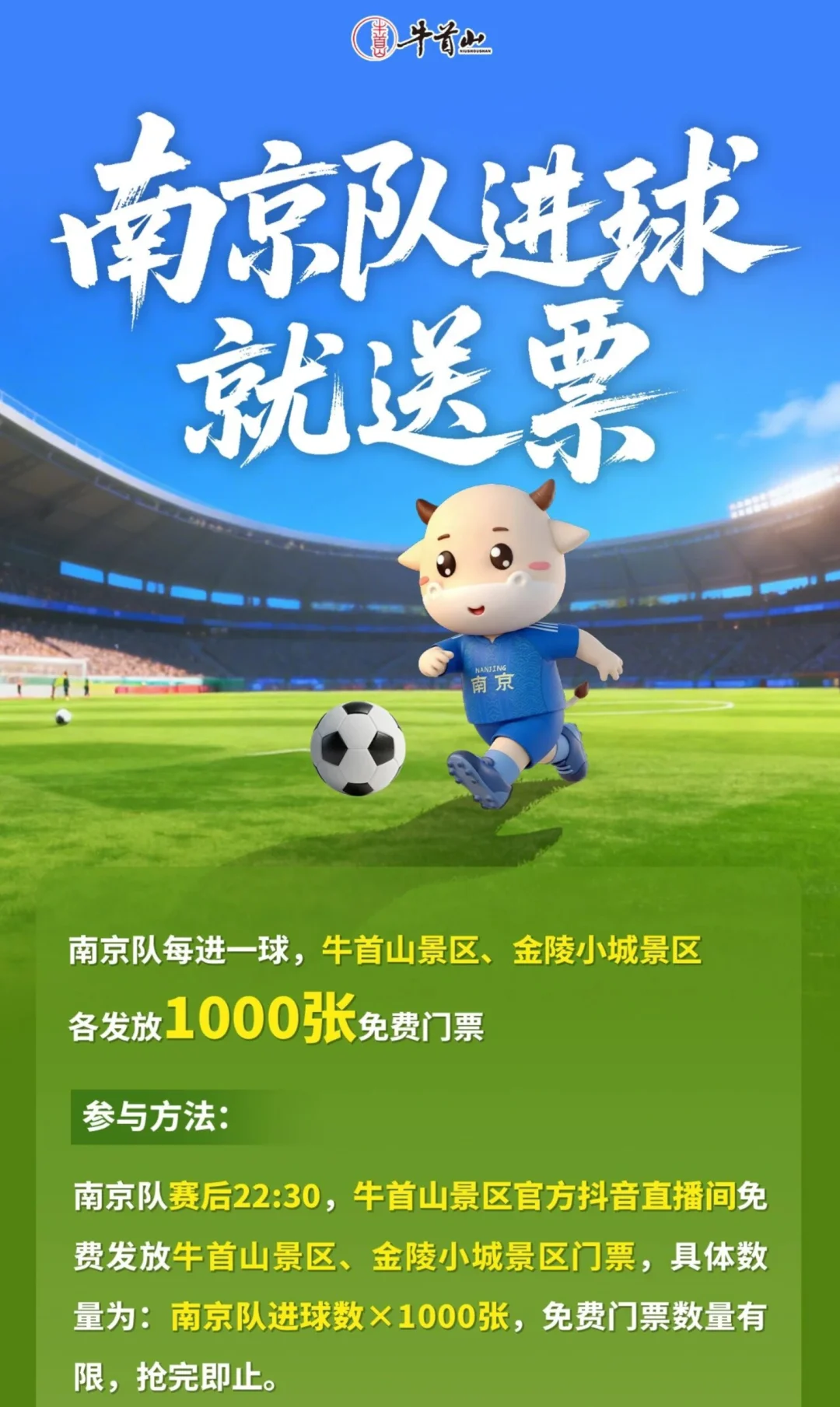 🖥️参与方法:南京队赛后22:30,牛首山景区官方🎶免费发放牛首山景区、金陵小城景区门票,具体数量为:南京队进球数×1000张,免费门票数量有限,抢完即止