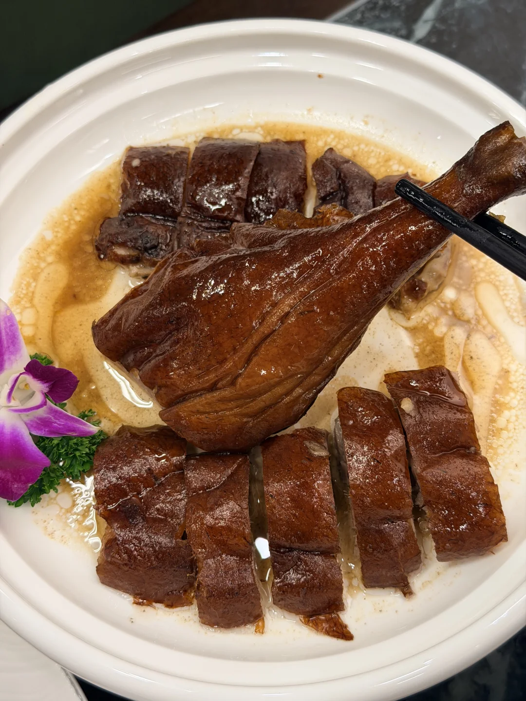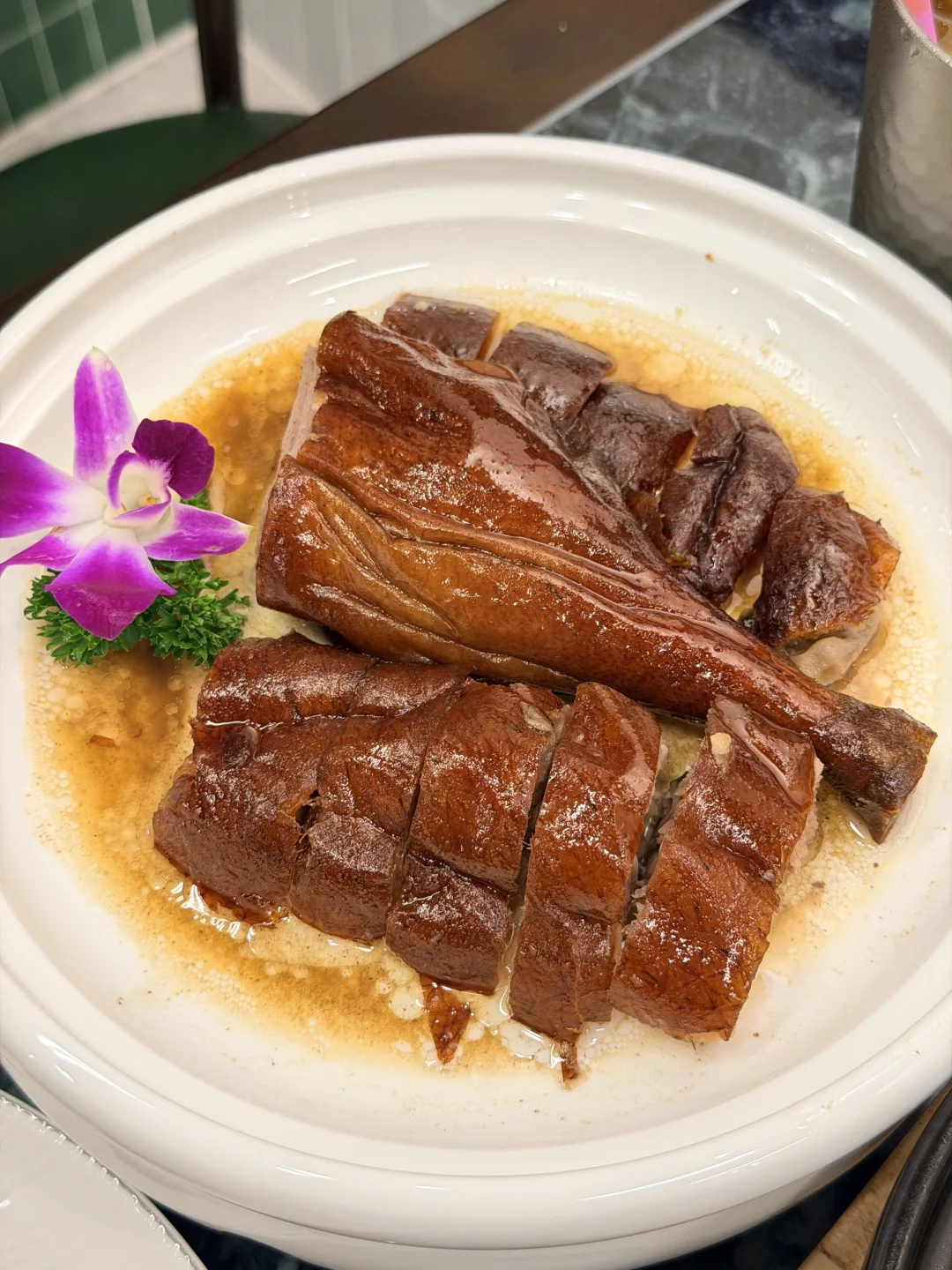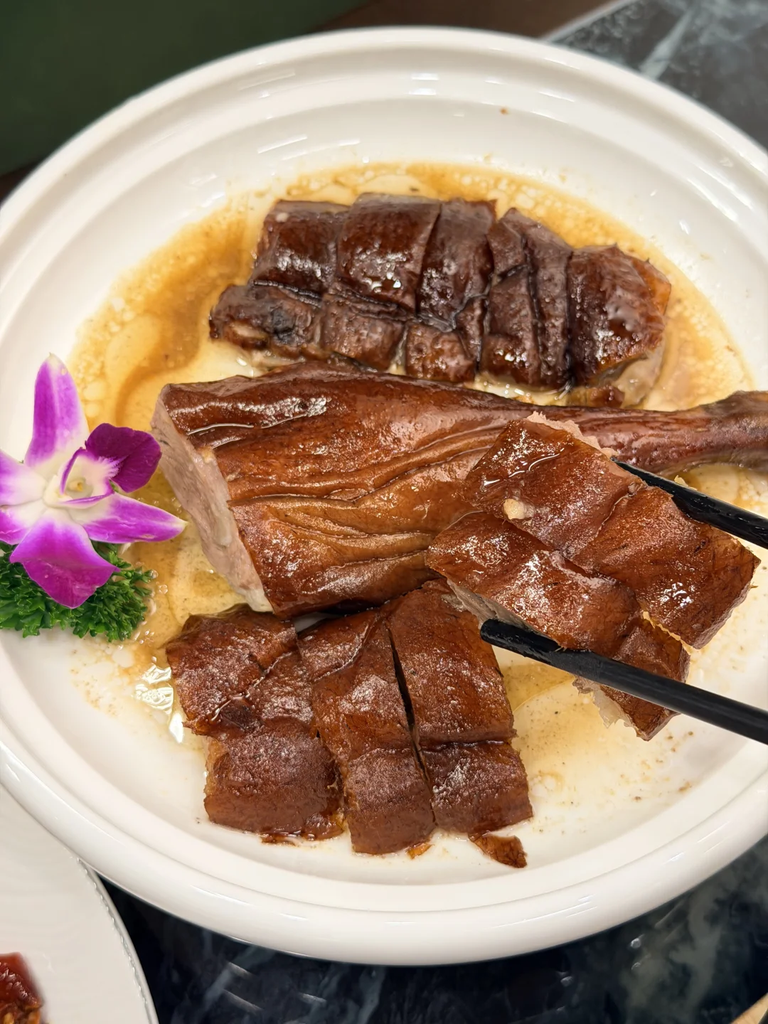 烧鹅界的标杆!外皮烤得金黄酥脆,咬下去咔嚓作响,鹅肉嫩到爆汁,蘸上秘制酸梅酱解腻又提香,一口直接梦回香港烧腊店,香到舔手指!